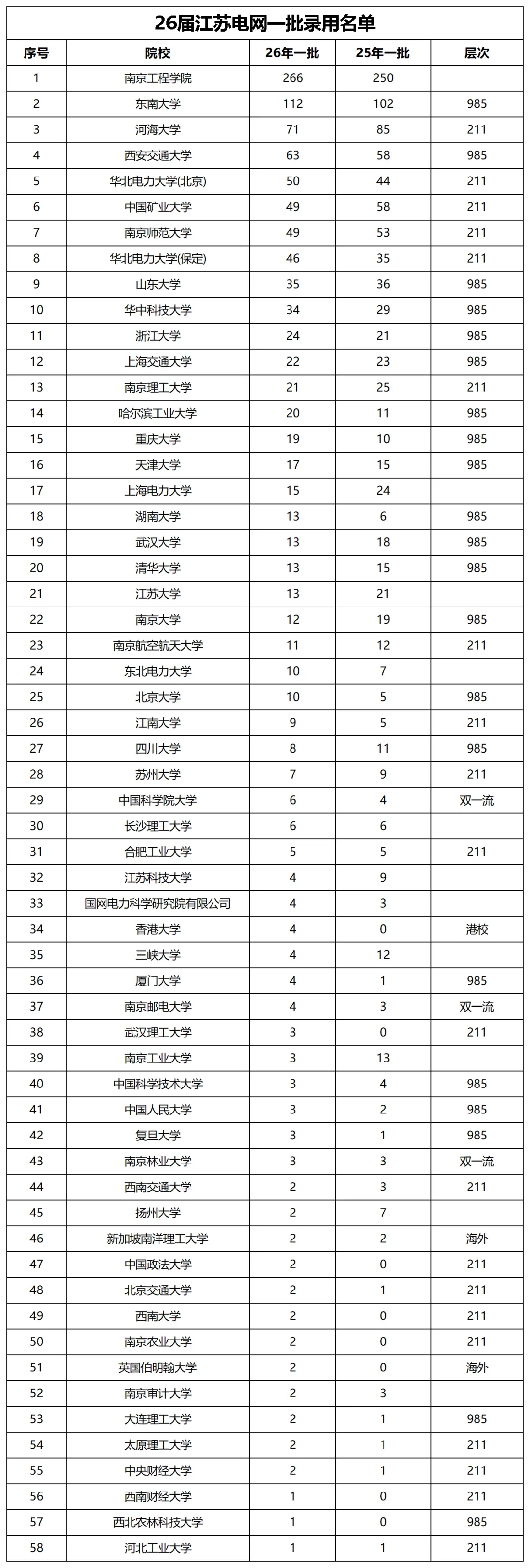 江苏电网2026届一批录用名单已经公示,共录取1153人。分析:录用人数超10人的高校:有南京工程学院、上海电力大学、江苏大学、东北电力大学4所外,其他都是985、211。