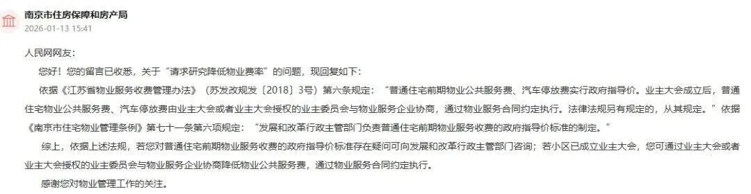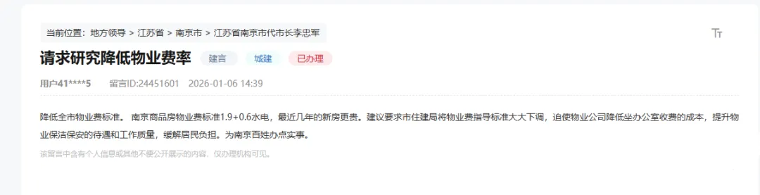 2026年1月6日,一名网友在“领导留言板”上反映“请求研究降低物业费”