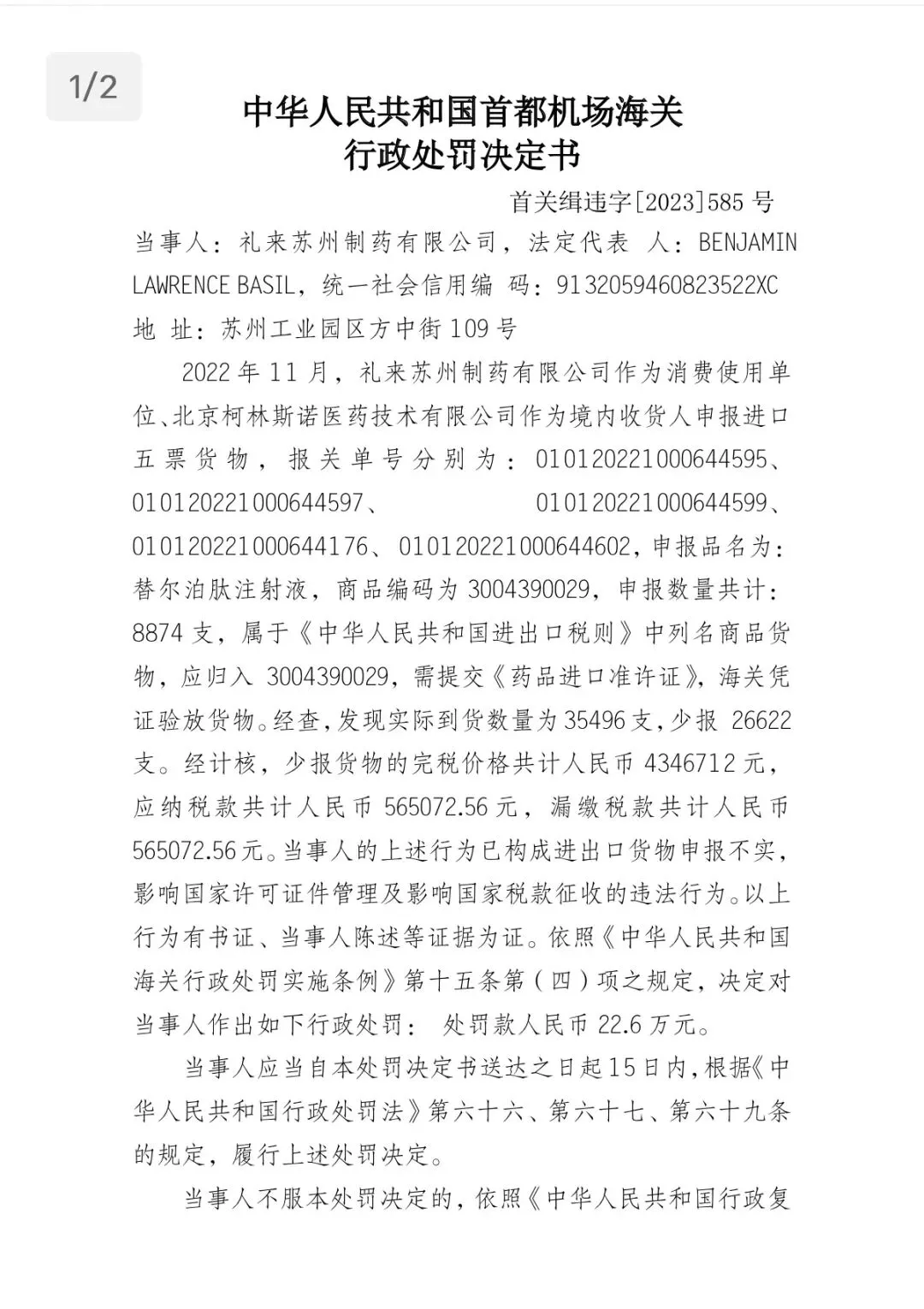 >苏州礼来制药被罚22.6万元