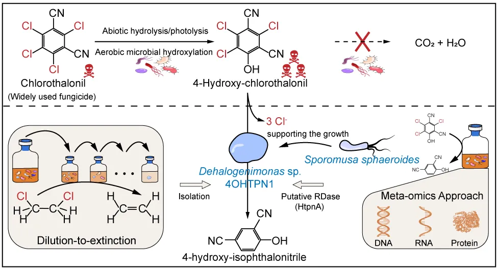 本研究围绕广谱杀菌剂百菌清的主要代谢产物—4-羟基-百菌清(4-OH-TPN)的厌氧微生物脱氯过程展开。虽然实验室前期研究发现,以Dehalogenimonas为主导的厌氧菌群可实现4-OH-TPN的还原脱氯,但负责该过程的关键功能菌株一直未被分离,其相应的还原脱卤酶基因(rdhA)也尚未明确,这限制了对该代谢路径的深入解析。宏基因组分析为解决这一难题提供了关键线索:发现Dehalogenimonas基因组草图中含有一个与1,2-二氯乙烷(1,2-DCA)还原脱卤酶基因(dcpA)高度同源的序列。鉴于此,本研究采用了替代底物分离策略:将富集底物从目标污染物4-OH-TPN,转换为更易被利用的1,2-DCA。这一策略成功克服了直接分离的瓶颈,最终通过绝迹稀释法成功获得一株纯培养菌株,命名为Dehalogenimonas sp. 4OHTPN1。系统发育分析初步表明,该菌株可能代表Dehalogenimonas中的一个新物种。基因组测序揭示其编码由33个rdhA和4个rdhB组成的复杂还原脱卤酶系统。为从该庞大的脱卤酶基因库中鉴定出负责4-OH-TPN脱氯的关键基因,本研究进一步整合了转录组与蛋白质组学分析。分析结果清晰地揭示了菌株对不同电子受体的底物特异性响应机制:当以4-OH-TPN为唯一电子受体时,rdhA26(本研究将其命名为htpnA)基因的表达被特异性且显著诱导,其转录水平和蛋白表达量分别达到所有rdhA基因平均值的25.0倍和10.2倍,表明htpnA基因是驱动4-OH-TPN脱氯的核心功能基因。与之形成鲜明对比的是,在仅添加1,2-DCA的条件下,与dcpA同源的rdhA25基因被显著诱导,其转录与蛋白表达量分别为平均值的10.1倍和9.8倍。综上所述,本研究取得了两方面的关键进展:第一,首次分离到一株具有4-OH-TPN脱氯能力的Dehalogenimonas纯培养菌株,为深入研究该属微生物的生理生态与降解潜力提供了宝贵的菌种资源;第二,首次在该菌株中解析了负责4-OH-TPN脱氯的关键还原脱卤酶基因htpnA,并明确了其对底物的高度特异性,从而填补了关于百菌清厌氧代谢关键酶基因的认知空白。本研究成果不仅拓展了对Dehalogenimonas功能多样性的认识,也为今后系统解析复杂卤代有机污染物的微生物降解网络,提供了从菌株分离到功能基因鉴定的成功方法范例。