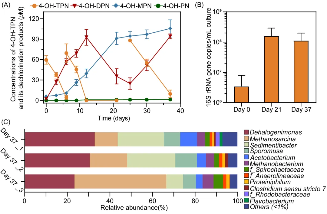 本研究采用4-OH-TPN对脱氯菌群进行驯化富集。经过37天三个周期的培养,31.5 μmol的4-OH-TPN被逐步脱氯,生成4-OH-DPN(12.0 ± 0.4 μmol)、4-OH-MPN(13.0 ± 1.4 μmol)和4-OH-PN(1.3 ± 0.5 μmol),剩余底物仅1.3 ± 0.6 μmol(残留率4.0 ± 2.0%)。在此过程中,脱卤单胞菌的16S rRNA基因拷贝数从初始的4.9×10⁶ copies/mL显著增长至第21天的1.6×10⁸ copies/mL,并维持高丰度;其生长得率为7.3×10⁸ cells/(μmol Cl⁻)。菌群结构分析表明,富集后的脱氯菌群主要由脱卤菌(Dehalogenimonas)、产甲烷菌(Methanosarcina和Methanobacterium)以及发酵菌(Sedimentibacter、Sporomusa、Acetobacterium、 f_Anaerolineaceae、Proteiniphilum和Clostridium)组成,占整个菌群的95.1 ± 1.5%。脱氯过程伴随甲烷生成,累计产量达5.37 ± 1.37 mM。本研究最终获得了一个结构简单、脱氯功能稳定且以Dehalogenimonas为核心的功能菌群。