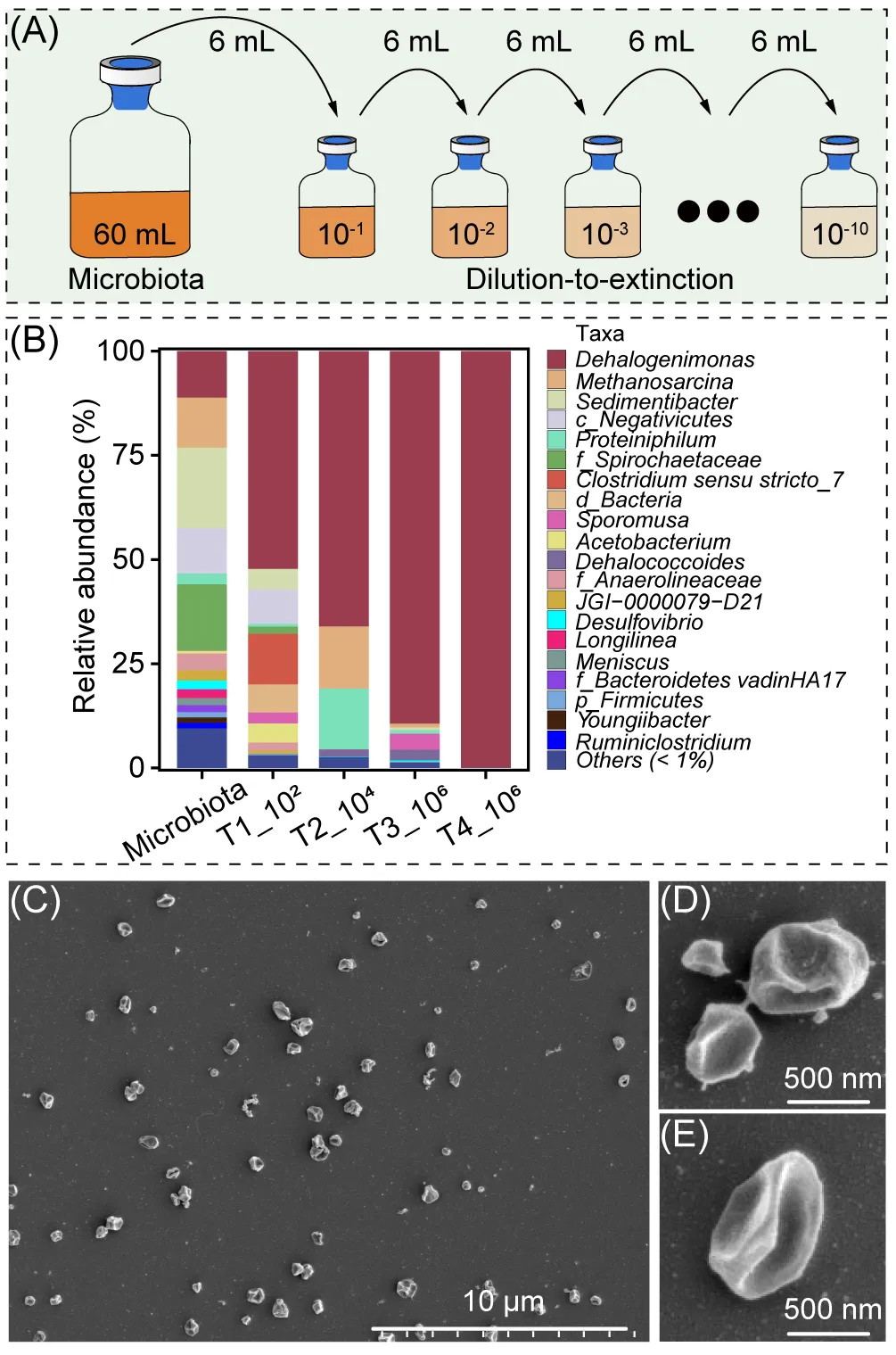 基于宏基因组分析,发现该脱氯菌群中的脱卤单胞菌编码DcpA同源蛋白,且对1,2-DCA的脱氯速率(10.7 ± 0.6 μmol/天)显著高于对4-OH-TPN(1.3 ± 0.04 μmol/天),并能支持更高的细胞得率。因此,本研究选用1,2-DCA作为电子受体以促进Dehalogenimonas的分离。鉴于其基因组缺乏合成肽聚糖的能力,分离过程中使用氨苄青霉素和万古霉素抑制细胞壁合成。随着电子供体由乳酸改为氢气,并受高浓度1,2-DCA抑制,产甲烷菌与发酵菌逐渐消失,而Dehalogenimonas丰度持续上升。经多轮稀释培养后,其相对丰度达到99.9%(图3A,B),最终获得纯培养物,命名为菌株4OHTPN1。该菌株经PCR-RFLP及完整基因组测序证实为单一物种,细胞呈不规则球状,直径0.5-0.7 μm。它能够利用氢气或甲酸作为电子供体,乙酸作为碳源,并将三氯乙烯脱氯为顺/反-1,2-二氯乙烯,但未检测到其他测试氯化物的脱氯活性。全基因组中未发现已知三氯乙烯还原脱卤酶的同源基因,其对应的RdhA仍有待鉴定。