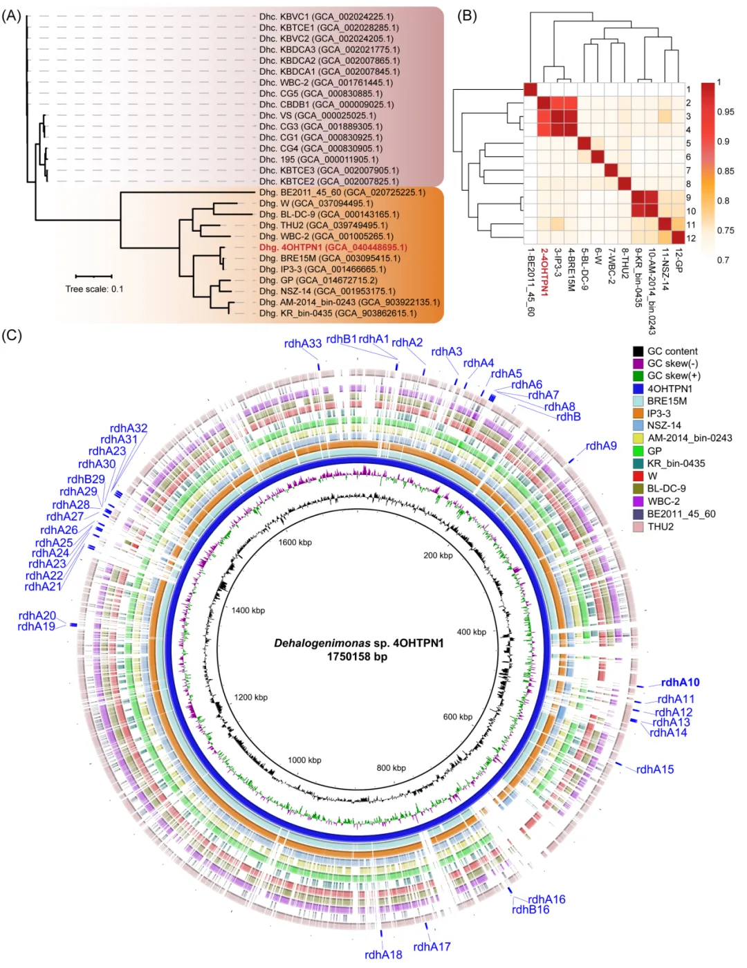 基于Illumina和PacBio测序,获得了Dehalogenimonas菌株4OHTPN1的完整基因组。其大小为1.75 Mb,GC含量55.9%,包含1824个预测基因。与该属其他已知基因组比较显示,菌株4OHTPN1与Dehalogenimonas alkenigignens BRE15M的16S rRNA基因相似性为99.9%,但平均核苷酸一致性(91.5%)和数字DNA-DNA杂交值(44.3%)均低于物种界定阈值,表明其可能为该属的一个新物种。该基因组编码33个rdhA基因和4个rdhB基因,其中30个rdhA基因具有典型的TAT信号肽、脱卤酶结构域及铁硫簇。rdhA23基因以串联重复形式存在,其侧翼区域含有转座酶及功能相同的重复基因,暗示该重复可能由转座事件导致。