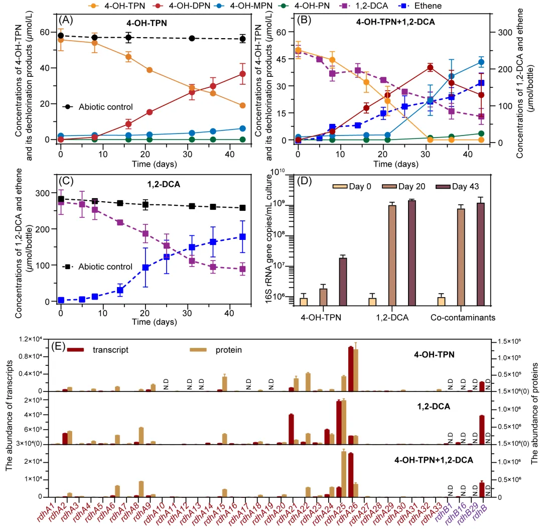 本研究通过纯培养实验考察了菌株4OHTPN1对4-OH-TPN和1,2-DCA的脱氯能力与相关基因表达。结果显示,该菌株可独立降解两种污染物:4-OH-TPN脱氯速率约1.0 μmol/L/天,1,2-DCA则达8.6 μmol/天。当两者共存时,1,2-DCA能显著促进4-OH-TPN的脱氯速率(提升至2.9 μmol/L/天)及菌体生长,而4-OH-TPN对1,2-DCA脱氯无影响。利用多组学分析发现,不同的污染物特异性诱导了不同rdhA基因的高表达:在仅添加4-OH-TPN时,rdhA26(命名为htpnA)的转录与蛋白表达水平最高;而在仅添加1,2-DCA时,一个dcpA同源基因rdhA25表达最高。两者共存时,htpnA和rdhA25均为高表达基因。这一结果说明其脱氯活性由不同的特异性还原脱卤酶介导,而非双功能酶。蛋白质组数据进一步验证了HtpnA与RdhA25的高丰度存在。系统发育分析表明,HtpnA与已知的多氯联苯还原脱卤酶PcbA4一致性较高(65.3%),而RdhA25与DcpA高度同源(95.9%)。结合其在脱氯过程中的特异性高表达,强烈提示HtpnA负责催化4-OH-TPN的完全还原脱氯。菌株基因组中其他多个rdhA基因也有一定表达,可能参与脱氯途径的不同步骤,但其功能尚不明确。