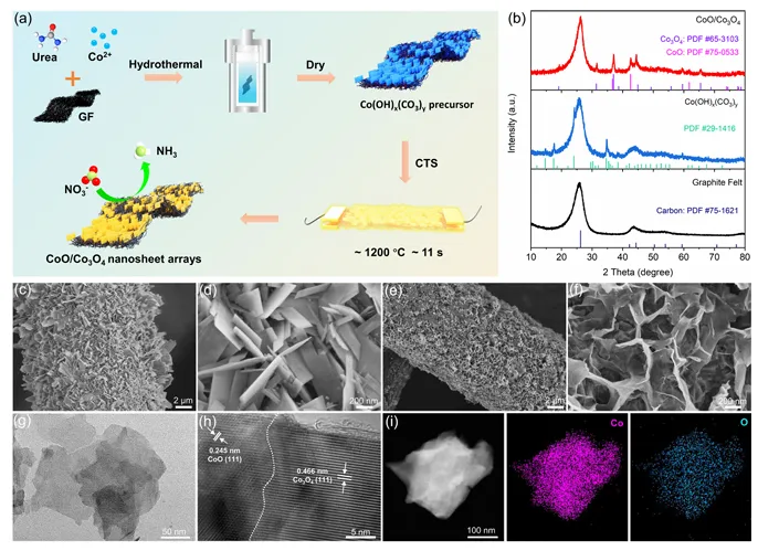 图1展示了CoO/Co₃O₄纳米片阵列电极的合成及其表征。图1a展示了CoO/Co₃O₄纳米片阵列电极的合成示意图。该过程包括水热反应生长Co(OH)x(CO₃)y前驱体,在石墨毡表面形成纳米片结构,然后使用超快碳热冲击(CTS)策略进行处理,最终形成CoO/Co₃O₄纳米片阵列。图1b展示了X射线衍射(XRD)图谱,证明了CoO和Co₃O₄的晶相结构。图中的衍射峰表明CoO和Co₃O₄共存。图1c展示了Co(OH)x(CO₃)y前驱体的扫描电子显微镜(SEM)图像,显示出纳米片阵列的形貌,均匀分布于GF表面。图1d展示了另一视角的SEM图像,进一步确认了Co(OH)x(CO₃)y前驱体的纳米片结构。图1e展示了经过CTS处理后的CoO/Co₃O₄电极的SEM图像,纳米片阵列的形态得以保持,且更薄的纳米片结构有利于提升电催化反应速率。图1f展示了另一个角度的SEM图像,进一步确认了CTS处理后的电极形貌。图1g展示了CoO/Co₃O₄电极的透射电子显微镜(TEM)图像,揭示了纳米片的超薄结构。图1h展示了高分辨率TEM图像,显示了Co₃O₄和CoO的晶格条纹,证明了CoO和Co₃O₄的相共存。图1i展示了元素映射图,显示了Co和O元素在CoO/Co₃O₄电极上的均匀分布,验证了CoO/Co₃O₄异质结构的成功构建。