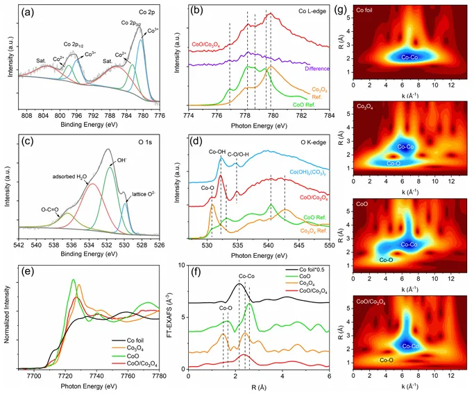 图2展示了CoO/Co₃O₄电极的XPS、XAS和FTIR分析结果,揭示了其表面和电子结构特征。图2a展示了Co 2p XPS高分辨谱图,显示了CoO/Co₃O₄电极中的Co²⁺和Co³⁺成分,确认了CoO和Co₃O₄的混合价态。图2b展示了Co L边X射线吸收谱(XAS),表明CoO/Co₃O₄电极的XAS特征与CoO和Co₃O₄的标准谱图相符,进一步证实了其混合价态。图2c展示了O 1s XPS高分辨谱图,揭示了CoO/Co₃O₄电极中羟基(OH⁻)的强烈信号,表明电极表面富含羟基。图2d展示了O K边XAS谱图,确认了CoO/Co₃O₄电极中Co−O和Co−OH物种的共存。图2e展示了Co K边XANES谱图,显示CoO/Co₃O₄电极的吸收边位于CoO和Co₃O₄之间,表明Co的价态介于+2和+3之间。图2f展示了FT-EXAFS曲线,表明CoO/Co₃O₄电极的Co−O和Co−Co散射峰强度减弱,支持晶格羟基的引入。图2g展示了波let转换(WT)EXAFS谱图,表明CoO/Co₃O₄电极中Co−Co散射峰明显增强,而Co−O信号减弱,进一步验证了晶格羟基的引入。