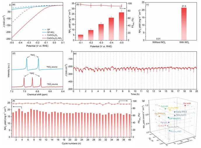 图3展示了CoO/Co₃O₄电极的电催化硝酸盐还原性能评估。图3a展示了线性扫描伏安法(LSV)曲线,表明CoO/Co₃O₄电极在含NO₃⁻的电解液中表现出显著的电催化活性,电流密度增加。图3b展示了氨产率和法拉第效率(FE)在不同电位下的变化,表明CoO/Co₃O₄电极在−0.4 V vs RHE时氨产率为21.5 mg h⁻¹ cm⁻²,法拉第效率为93.4%。图3c展示了在不含NO₃⁻的电解液中,CoO/Co₃O₄电极几乎没有氨产率,证明了氨产物确实来自硝酸还原反应。图3d展示了¹H核磁共振(NMR)谱图,确认了氨产物来源于电催化硝酸还原反应。图3e展示了在−0.4 V vs RHE下,CoO/Co₃O₄电极在20小时操作中的电流密度变化,显示出良好的电化学稳定性。图3f展示了CoO/Co₃O₄电极在连续40个周期操作中的氨产率和法拉第效率变化,显示出良好的循环稳定性。图3g展示了CoO/Co₃O₄电极与其他催化剂的比较,表明其在氨产率、法拉第效率和稳定性方面表现突出。