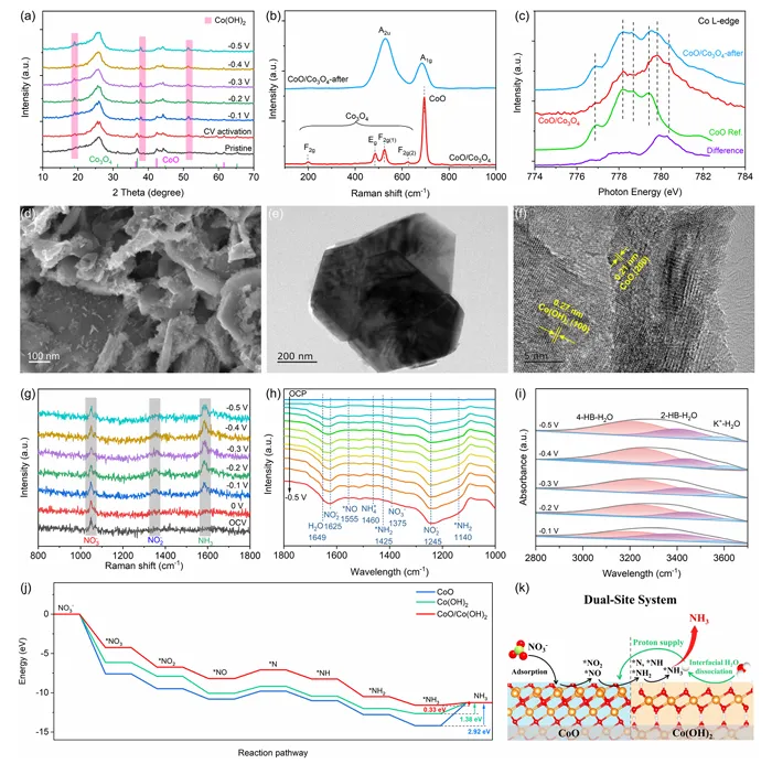 图4展示了CoO/Co₃O₄电极在电催化过程中发生的深度重构与相转化。图4a展示了不同电位下的Ex-situ XRD图谱,表明在−0.4 V vs RHE下Co₃O₄的衍射峰逐渐消失,Co(OH)₂的衍射峰显现,证明了电极在工作过程中发生了深度重构。图4b展示了CoO/Co₃O₄电极在电催化反应后的拉曼谱图,显示出Co(OH)₂的特征峰,进一步验证了相转化的发生。图4c展示了Co L边XAS谱图,CoO/Co₃O₄电极的谱图与Co(OH)₂特征相符,进一步支持了电极在反应过程中发生了相转化。图4d-f展示了CoO/Co₃O₄电极在电催化反应后的SEM、TEM和高分辨率TEM图像,表明电极发生了形貌变化,转化为CoO/Co(OH)₂异质结构。图4g-h展示了原位拉曼和FTIR谱图,揭示了NO₃⁻、NO₂⁻和NH₃中间体的变化过程,进一步阐明了CoO/Co(OH)₂在硝酸还原反应中的催化作用。图4i展示了原位FTIR分析,表明CoO/Co(OH)₂表面水分解行为促进了电催化反应,进而提高了NRA性能。图4j展示了DFT计算结果,揭示了CoO/Co(OH)₂的双位点催化机制,其中CoO促进NO₃⁻的吸附和中间体稳定,而Co(OH)₂加速水解离并降低氨的脱附能垒。图4k展示了CoO/Co(OH)₂异质结构的工作机制示意图,描述了CoO和Co(OH)₂的协同作用如何提高硝酸还原反应的催化活性。