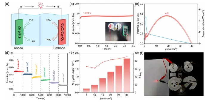 图5展示了基于CoO/Co₃O₄电极的Zn−NO₃⁻电池的性能评估,包括开路电压(OCV)、放电和功率密度曲线、氨产率及法拉第效率(FE)等。图5a展示了基于CoO/Co₃O₄电极的Zn−NO₃⁻电池示意图。电池采用CoO/Co₃O₄电极作为阴极,Zn金属板作为阳极。图5b展示了CoO/Co₃O₄电极的Zn−NO₃⁻电池的开路电压(OCV)曲线,电池在长时间内维持了较高的稳定电压(1.378 V vs Zn)。图5c展示了Zn−NO₃⁻电池在不同电流密度下的放电和功率密度曲线,表明该电池具有较高的功率密度(4.9 mW cm⁻²),优于一些最新报道的系统。图5d展示了在不同电流密度下的放电曲线,电池展现了出色的倍率性能。图5e展示了Zn−NO₃⁻电池在不同电流密度下的氨产率和法拉第效率(FE)。在30 mA cm⁻²的放电电流密度下,氨的产率达到了2.15 mg h⁻¹ cm⁻²,法拉第效率为90.55%。图5f展示了两块Zn−NO₃⁻电池串联后成功点亮一颗红光LED,表明该系统在氨合成、硝酸盐去除及可持续能源供应方面具有潜力。