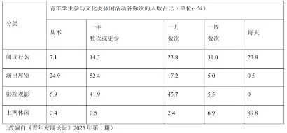 22.特点:①阅读行为参与频次相对较均衡;②演出展览参与频次低,多数人一年数次或更少;③影院观影参与频次集中在一月数次;④上网休闲每天参与人数占比高。建议:青年学生应增加演出展览等文化类休闲活动的参与频次,减少上网休闲时间,注重文化精品的欣赏,提升“文化体力”。(4分,特点2分,建议2分)