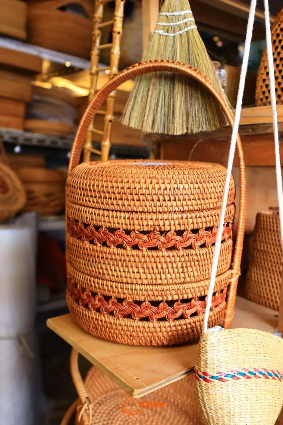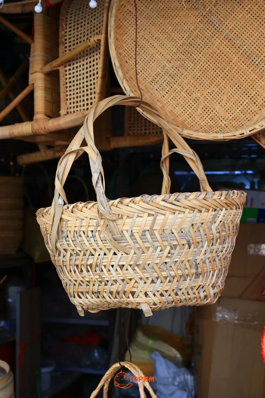 在店内,新与旧并不突兀。创新的竹编装饰品、竹编背包等深受不少年轻店主的喜爱,她们会买来用作国风店铺的摆台或美陈;放置多年自然老化的竹篮褪去了青绿色、被时光“染”成了酱色,自带一种岁月沉淀的温润与质感。