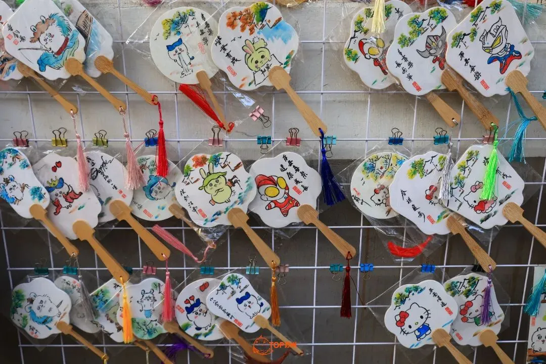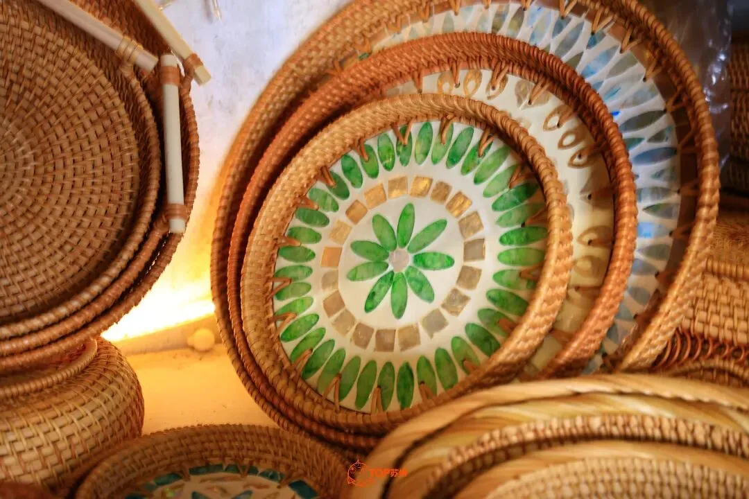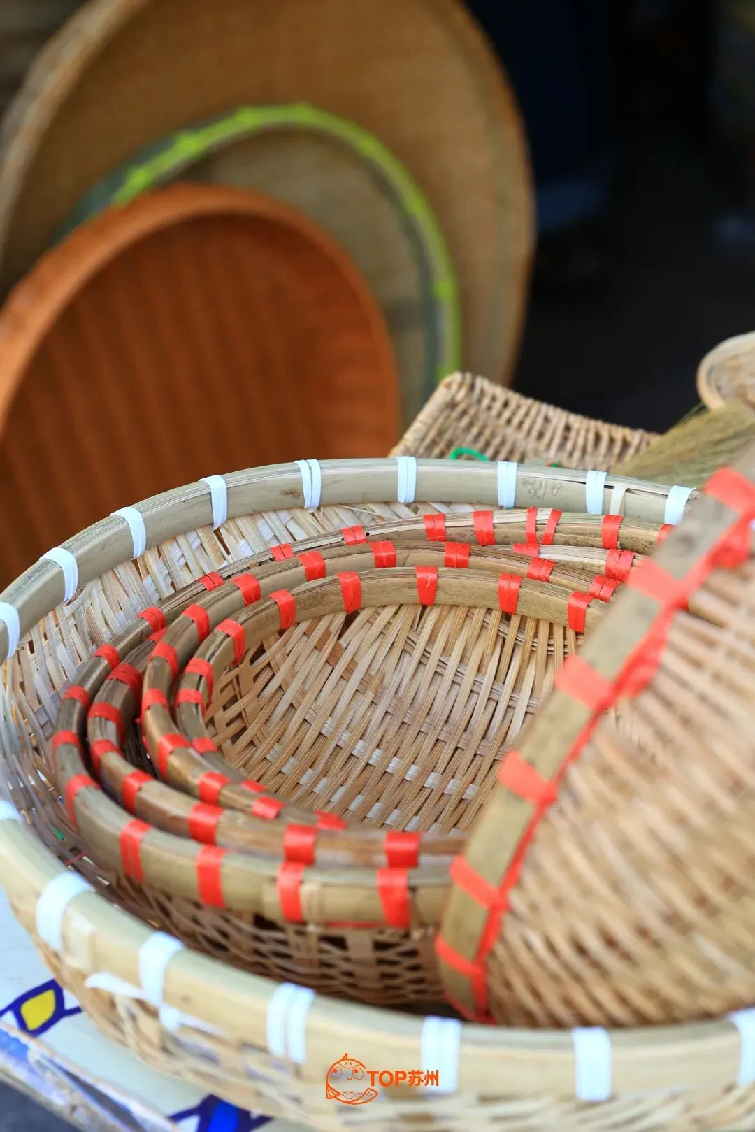 这家竹编百货店店如其名,店内有竹筐、竹篮、簸箕、蒲扇、藤编包等竹编品与藤编品,让小鲤一时看花了眼。同一品类的竹编品也有不同尺寸,圆形的簸箕根据不同做工,售价十几元到七八百元不等,最精细的一款大簸箕用藤收口、打磨光滑,摸上去像布一般。