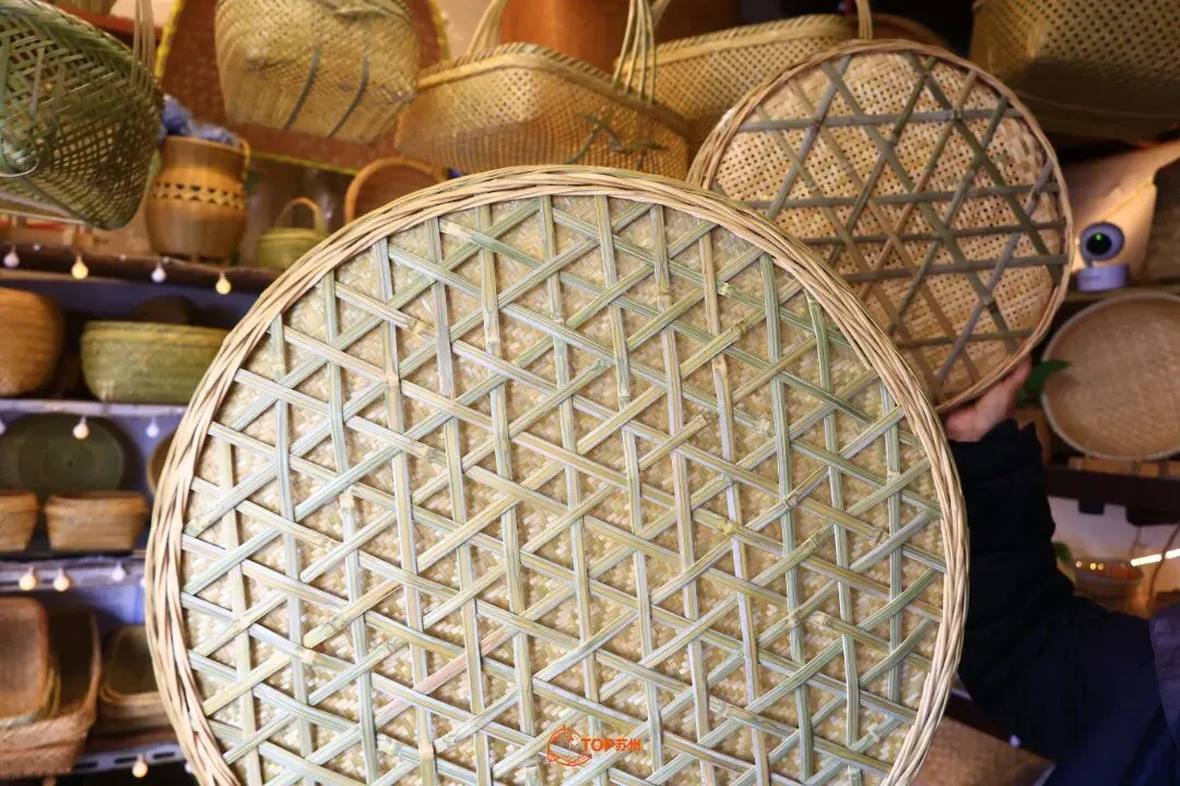 “你看,这个就是老苏州传统的六角篮。”竹编店店主蒋奶奶的女儿向小鲤展示着手工竹编篮子。店里售卖的竹编品大多是一位80多岁的亲戚做的,现在亲戚上了年纪,做一件耗时就会更久些。