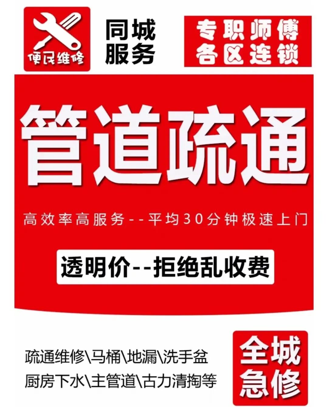 疏通下水道、马桶、蹲厕、地漏;疏通下水管;维修马桶漏水;维修水管;卫生间除臭、反味处理;脸盆、菜盆疏通;疏通墩布池;通坐便、蹲便、小便池;除尿碱;打捞贵重物品;疏通主管道、疑难管道、市政管道、工业管道;高压清洗车、抽粪车服务;上下水管安装、改管、维修