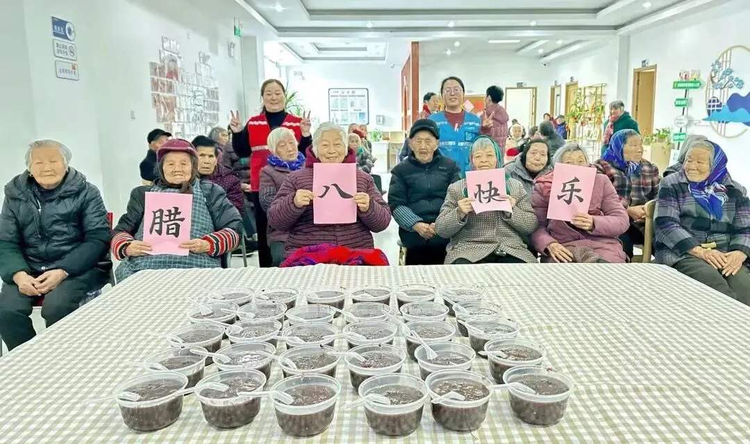翡翠家园社区日间照料中心:长辈们手持“腊八快乐”的字牌合影留念,眉眼间舒展的笑意,比粥里的蜜枣更甜。