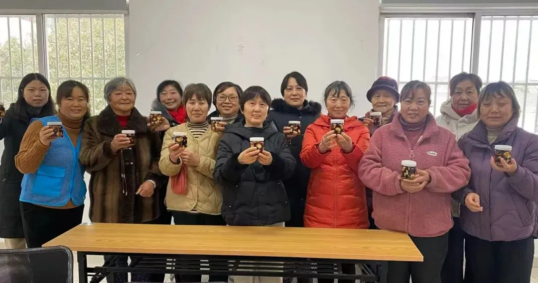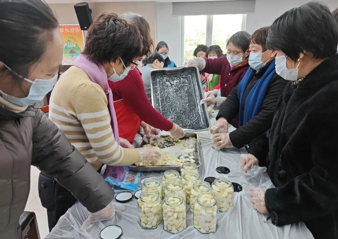 朱泾社区日间照料中心里,老人们围桌协作,在欢声笑语中为大蒜裹上糖霜。一罐罐贴着福字的腊八蒜,是邻里温情酿成的冬日暖礼。