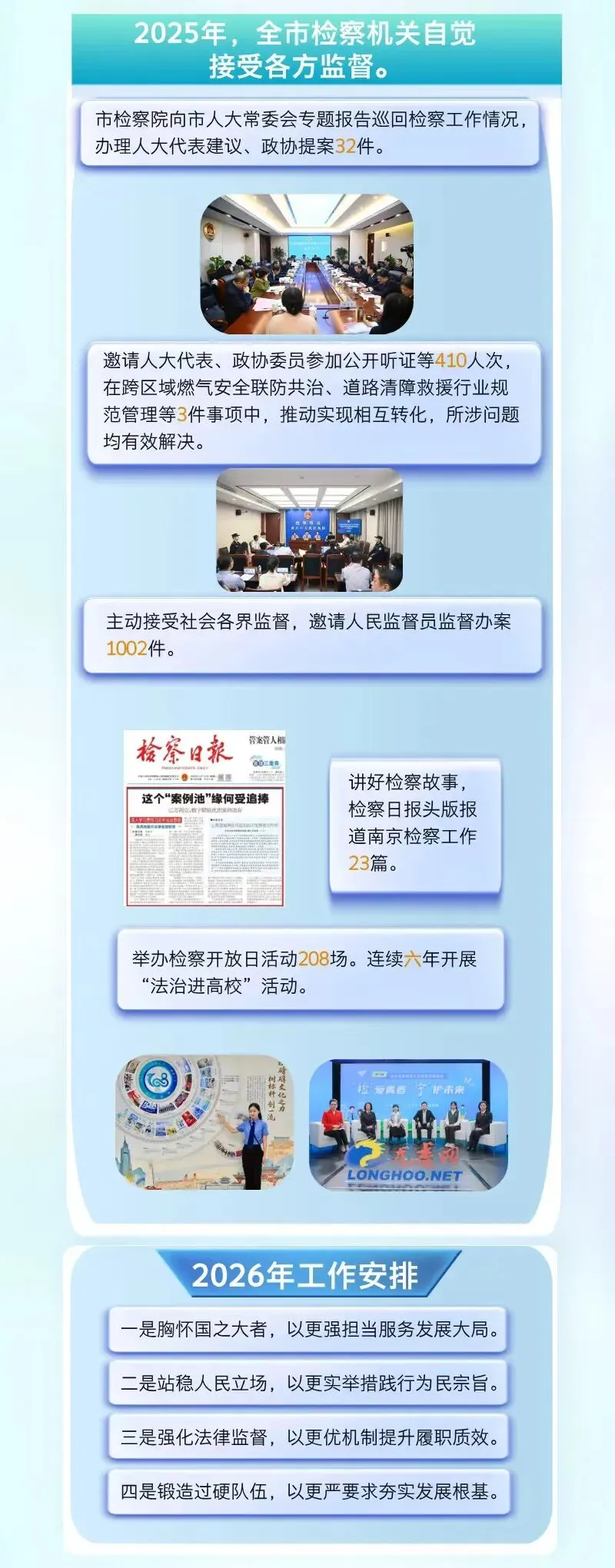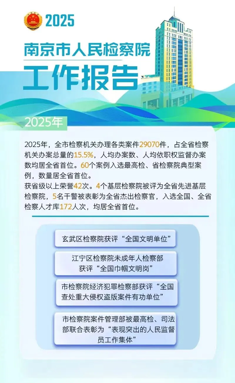 2025年,全市检察机关坚持以习近平新时代中国特色社会主义思想为指导,聚力打造“习近平法治思想的实践高地、检察工作现代化成果的展示高地”,在“服务大局、司法为民、法律监督、改革创新、队伍建设”五个方面争当标杆,为“强富美高”新南京现代化建设提供有力法治保障。