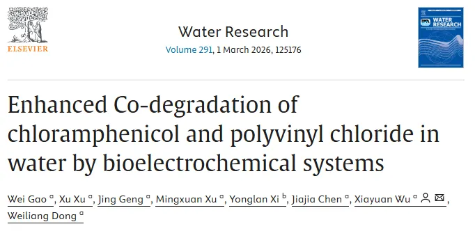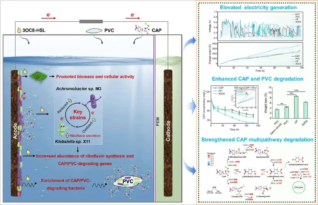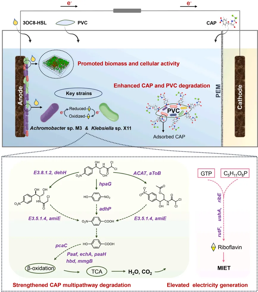 导语:近期,环境科学顶刊Water Research(影响因子=12.4,中科院一区top,自然指数期刊)发表题为“Enhanced Co-degradation of chloramphenicol and polyvinyl chloride in water by bioelectrochemical systems”的论文,揭示群体感应信号分子3OC8-HSL可显著提升微生物燃料电池对抗生素-微塑料复合污染的协同降解效能。