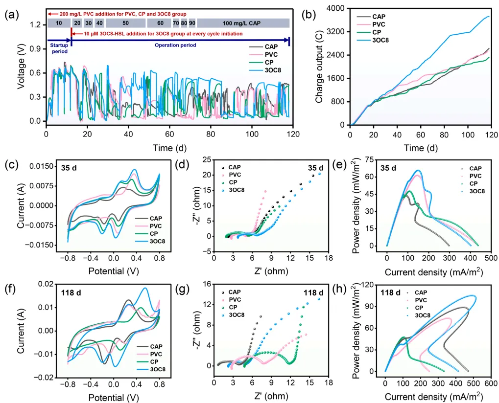 图 1.不同微生物燃料电池组的电压(a)和总电荷(b)输出;以及它们在 35 天和 118 天时的电化学性能:循环伏安法(c,f),电化学阻抗谱(d,g)和功率密度曲线(e,h)。