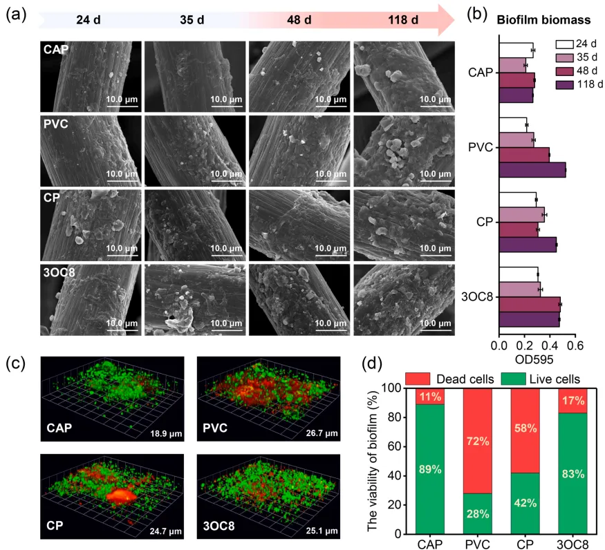 图 3. 运行 118 天后不同微生物燃料电池组中 PVC 薄膜的物理化学特性表征
