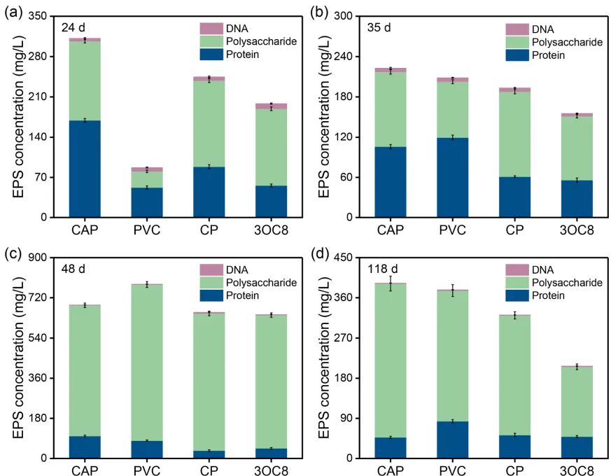 图 5. 不同微生物燃料电池组中阳极生物膜的胞外聚合物浓度在 24 天(a)、35 天(b)、48 天(c)和 118 天(d)时的情况。