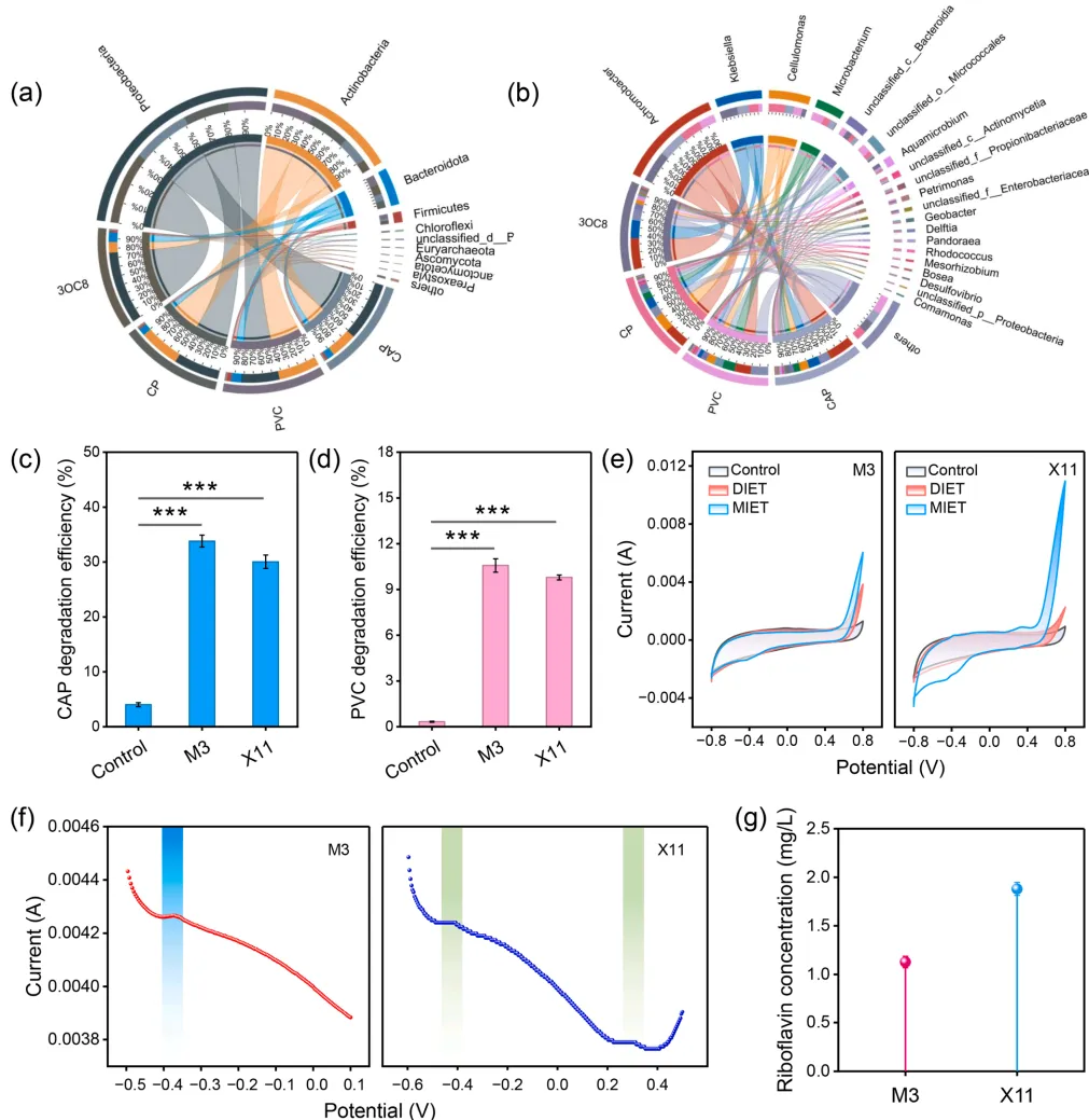 图 6. 不同 MFC 组在 118 天时阳极生物膜的微生物群落(a)门水平和(b)属水平;以及分离菌株 M3 和 X11 的 CAP(c)和 PVC(d)降解效率、CV(e)、DPV(f)和核黄素浓度(g)。