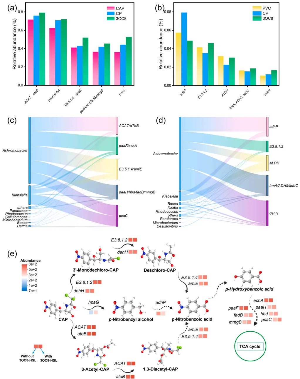 图 7. 参与 CAP 降解(a)和 PVC 降解(b)的前 5 个基因;物种与 CAP 降解(c)和 PVC 降解(d)功能基因相对丰度的相关性分析;3OC8 组中 CAP 降解的拟议途径及关键基因的相对丰度(e,实线表示单步反应,虚线表示多步过程)。