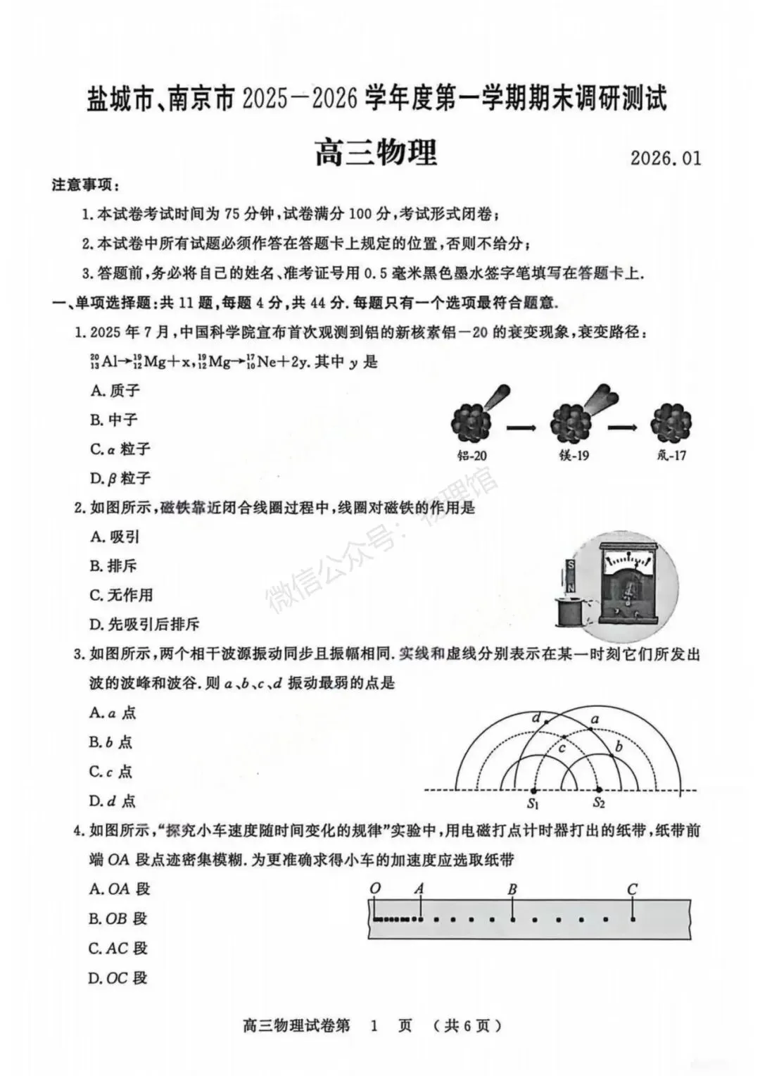 江苏省盐城市、南京市2026届高三上学期期末调研测试 物理含答案