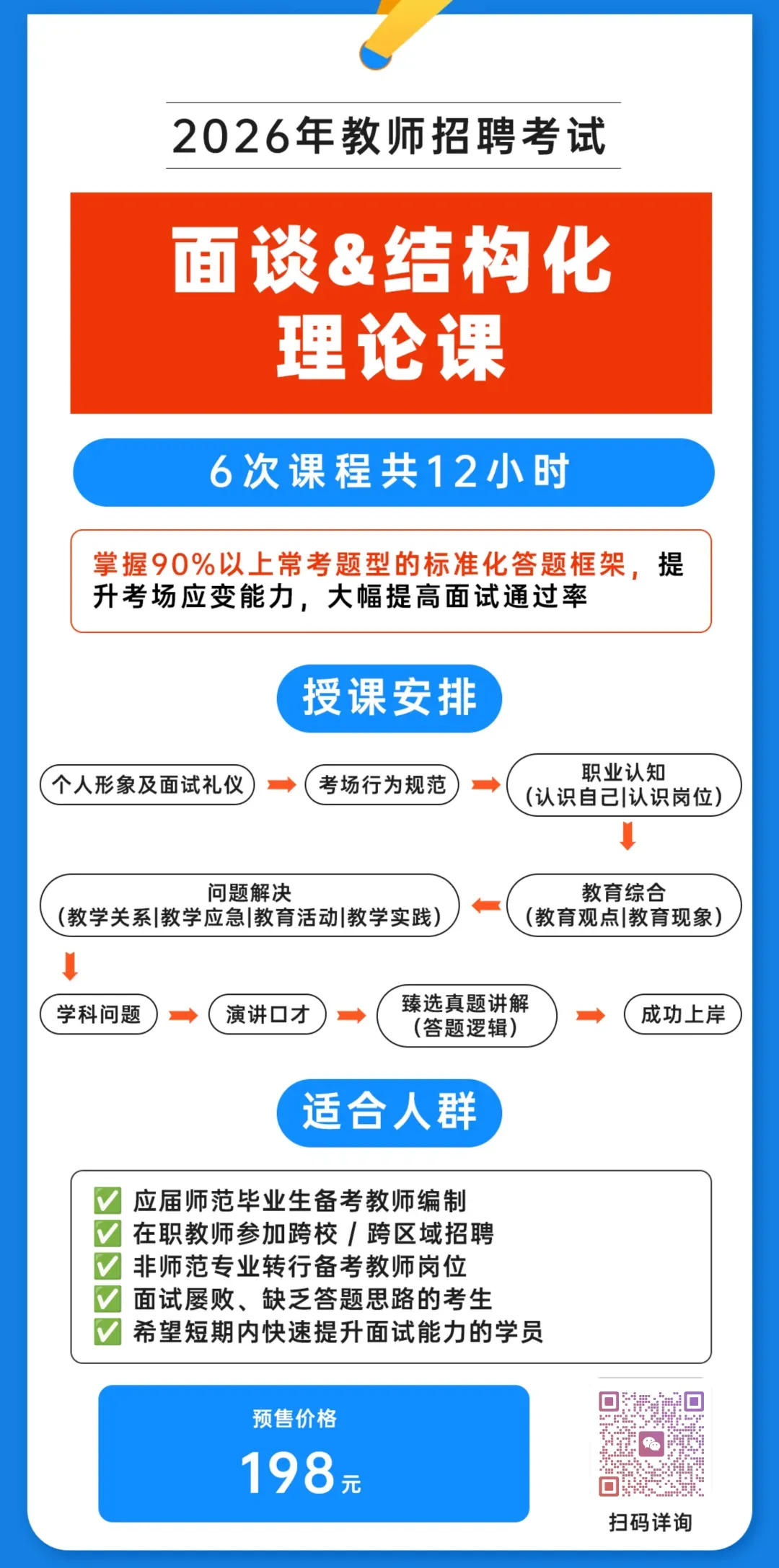 多种班型提供选择,预约一线在职教师授课,有学科带头人称号师资,立足考情和真题来培训!(试讲、结构化都能提供专业辅导)