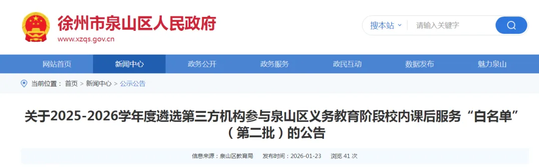 为认真贯彻落实《关于进一步减轻义务教育阶段学生作业负担和校外培训负担的意见》(中办发〔2021〕40号)、《省教育厅等五部门关于规范引导第三方机构参与中小学课后服务的通知》(苏教基函〔2025〕1号)、《徐州市关于规范非学科类校外培训机构参与学校课后服务工作的指导意见(试行)的通知》(徐教基〔2022〕26号)等文件精神,进一步规范泉山区校内课后服务工作,丰富校内课后服务课程体系,提升校内课后服务水平,现向社会公开遴选2025-2026学年第三方机构参与泉山区义务教育阶段校内课后服务“白名单”(第二批),有关事项公告如下: