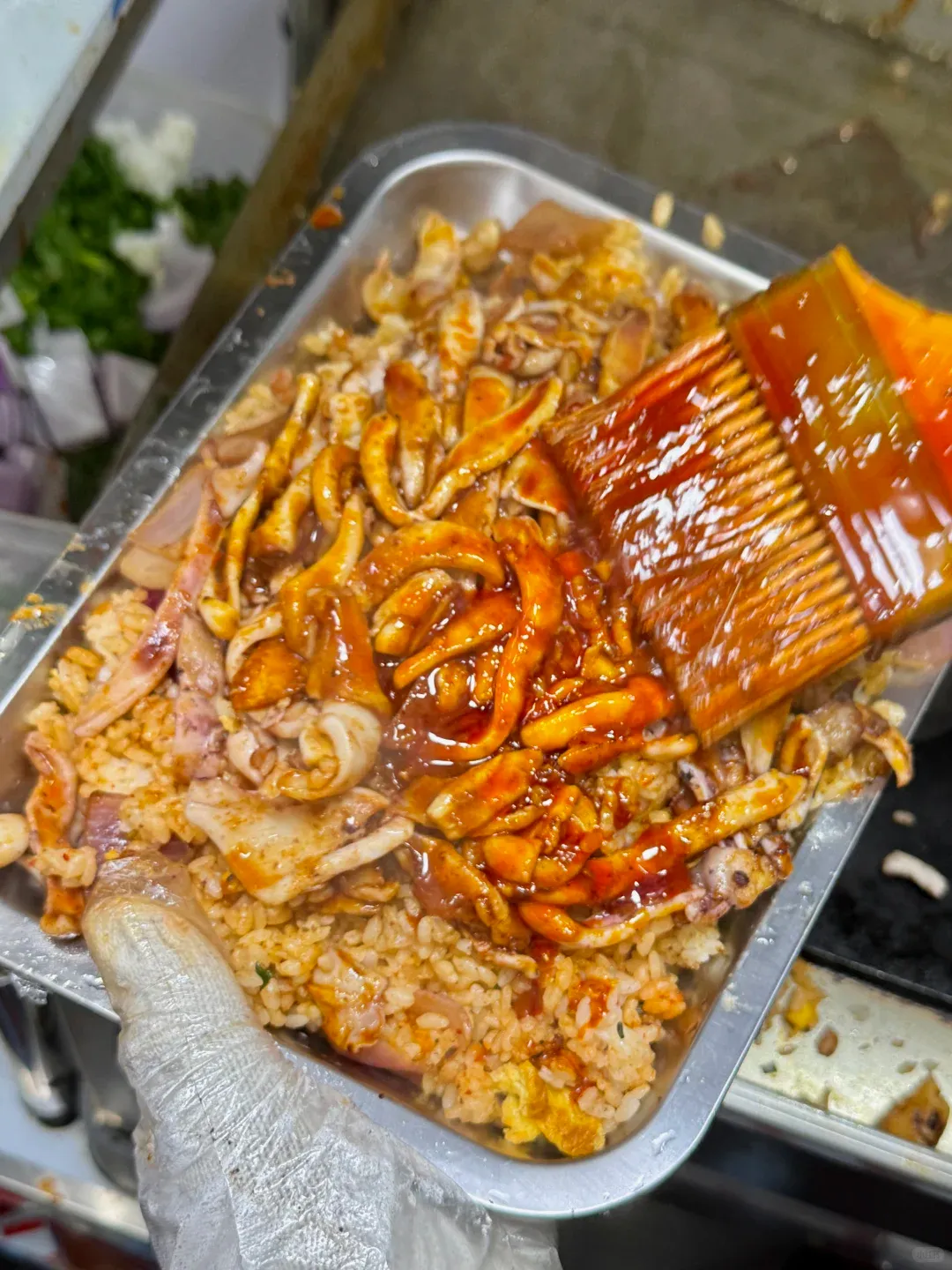 👍鱿鱼QQ弹弹有嚼劲,🌿搭配甜辣🌶️口的酱料和焦焦的洋葱💥简直香迷糊了!!