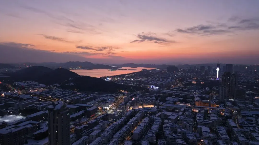 航拍下的徐州,屋顶覆着薄雪,电视塔亮灯,霞光中的云龙湖像一面镜子,倒映着整座城市
