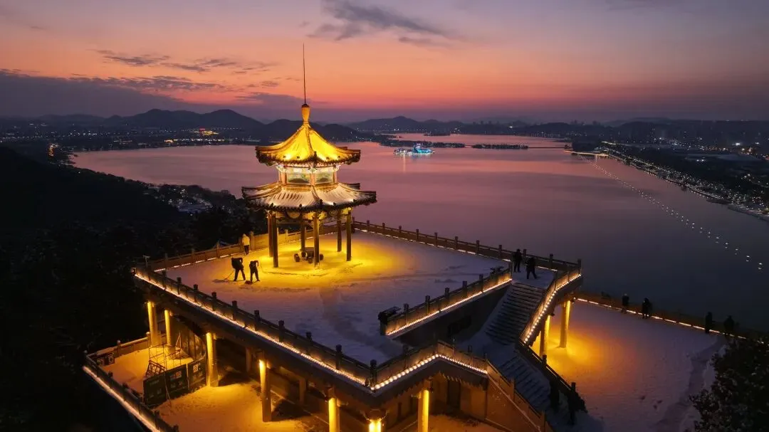 雪覆观景台台,华灯初上,这座亭子看了无数次日落,今天这场,是为看它的人准备的
