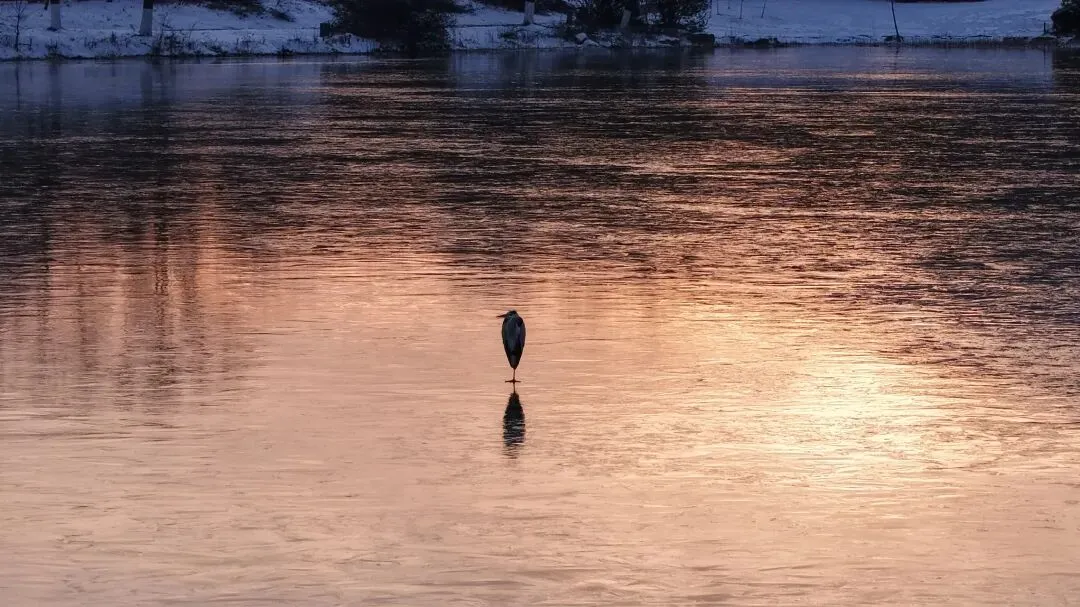 苍鹭在晚霞中独立,与自己的倒影为伴