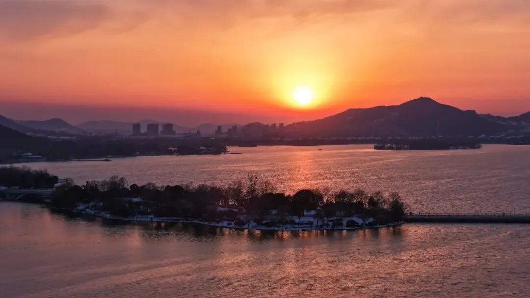 太阳慢慢沉向远山,在湖面铺开一条金光大道,小岛上的树木成了剪影,冬日的黄昏原来可以这么暖