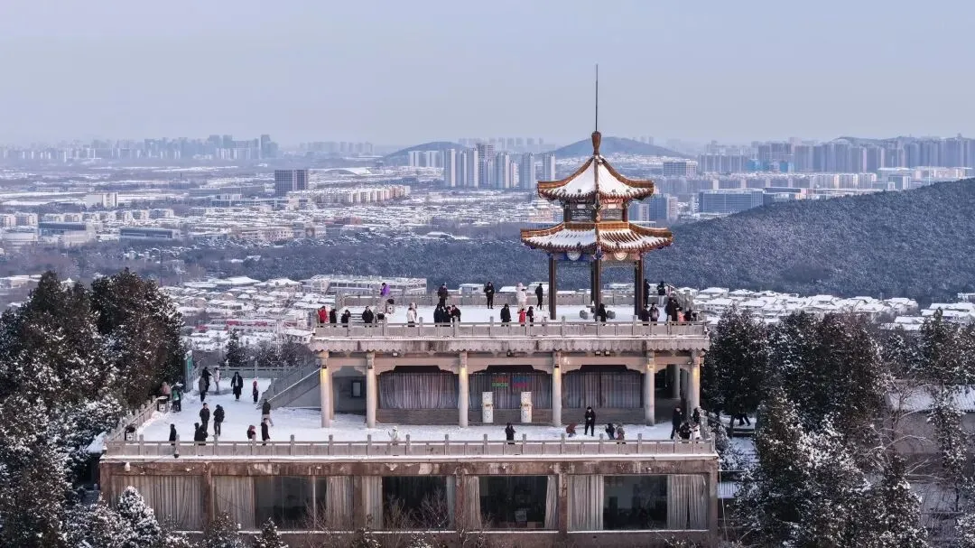 双层亭子覆着白雪,游客们在霞光中拍照,在徐州可以一边赏雪一边看日落