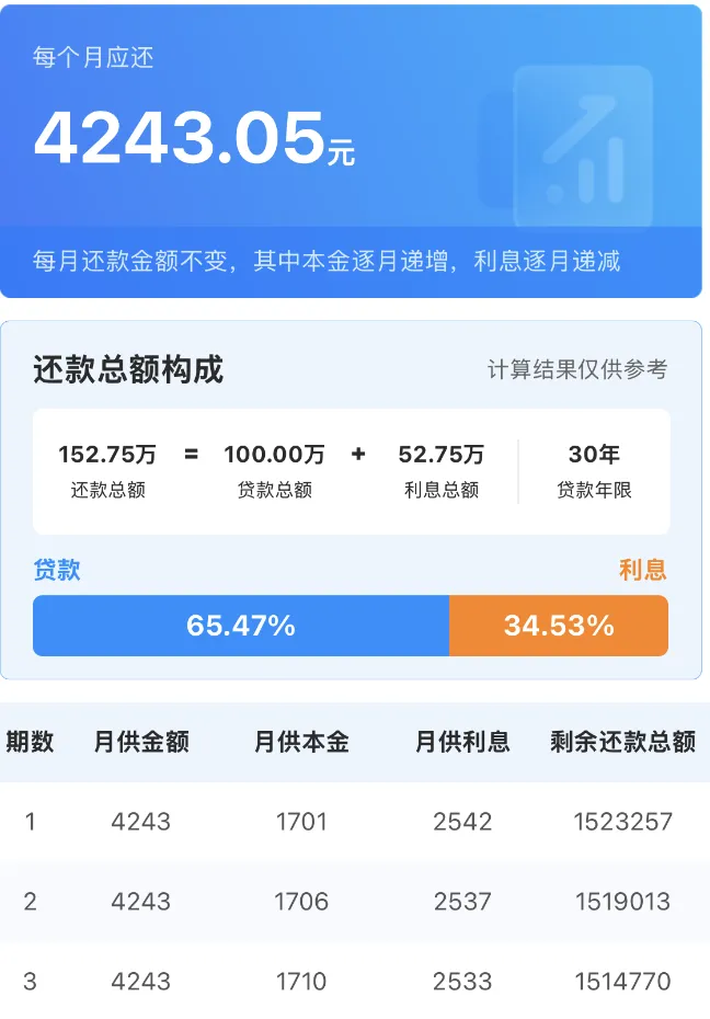 贴息之前,商贷利率是3.05%,每月还款金额4243元、30年还款金额152.75万元。