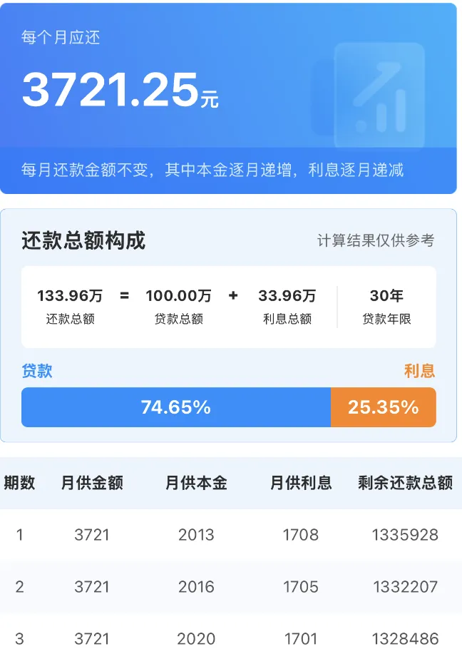在这里我们帮大家算笔账,以等额本息贷款30年、贷款金额100万举例: