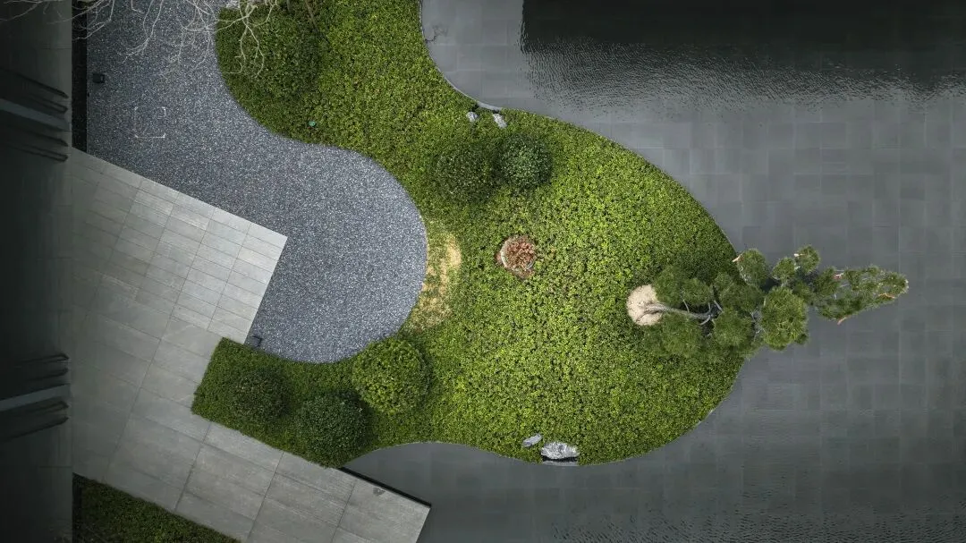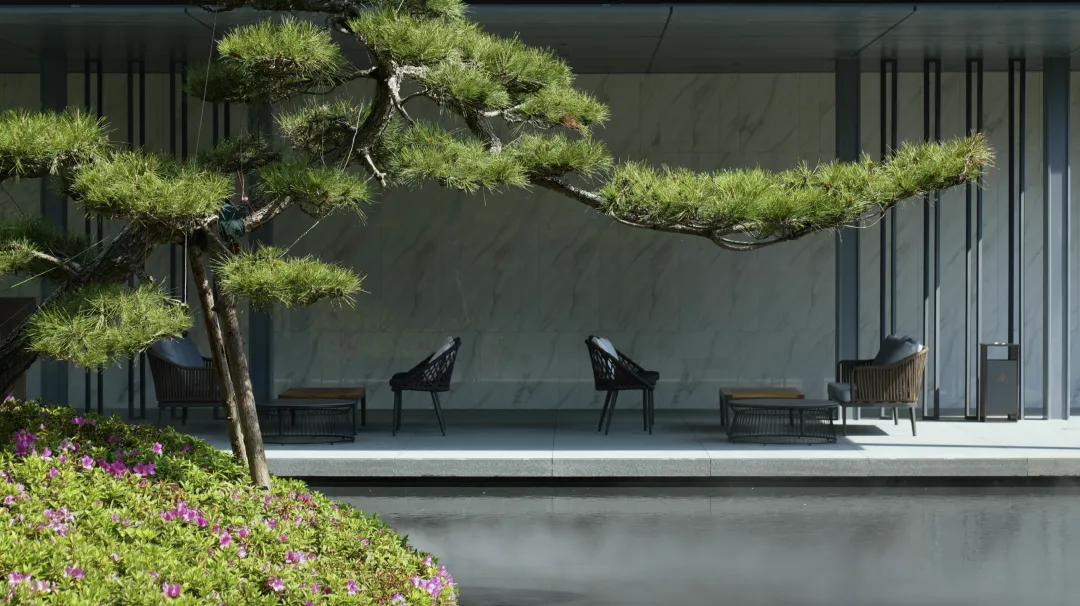 在做产品的时候,新盛对于选材把关非常严苛。不论是前庭落客区的海滨松,还是内部的迎客松、乌桕树,都是10年以上的高大树种。