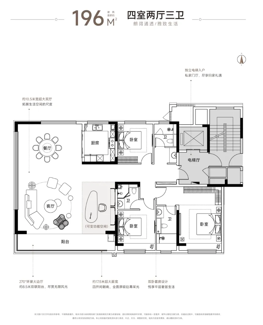 建面约143㎡、196㎡大平层带有270°的转角客厅,在这种内外多公园的社区里,拥有IMAX视野的观景台,是一件非常惬意的事情。同时最大的196㎡户型层高也做到了3.1米,保证纵向尺度感。