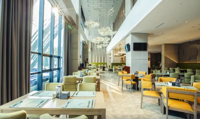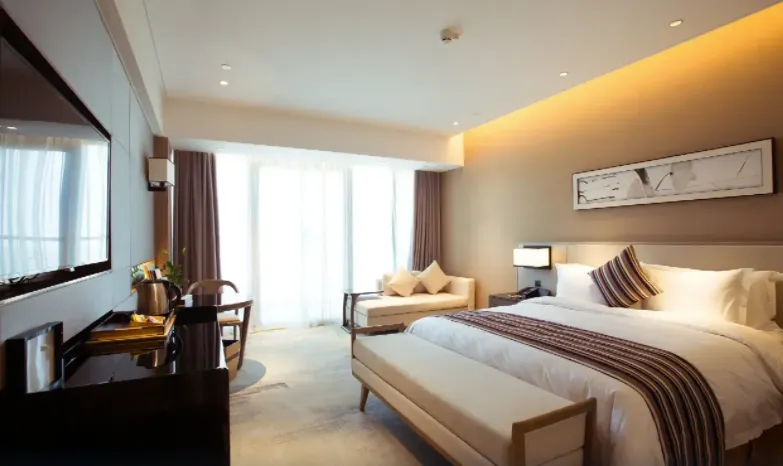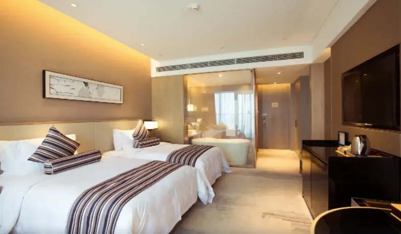 客房面积38m²,位于7-19楼。大床为1张2.0m*1.8m,双床房为2张2.0m*1.3m单人床。住在北面客房,拉开窗帘,可看到飞驰而过的高铁,夜晚仿佛流动的星河,充满梦幻之感。