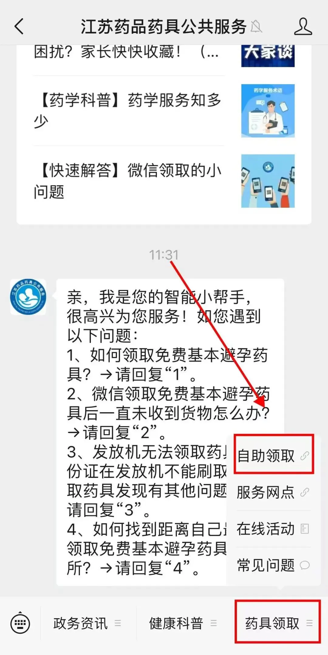 1、进入“江苏药品药具公共服务”公众号,点击页面右下角“药具领取”—“自助领取”菜单,进入微信领取首页;