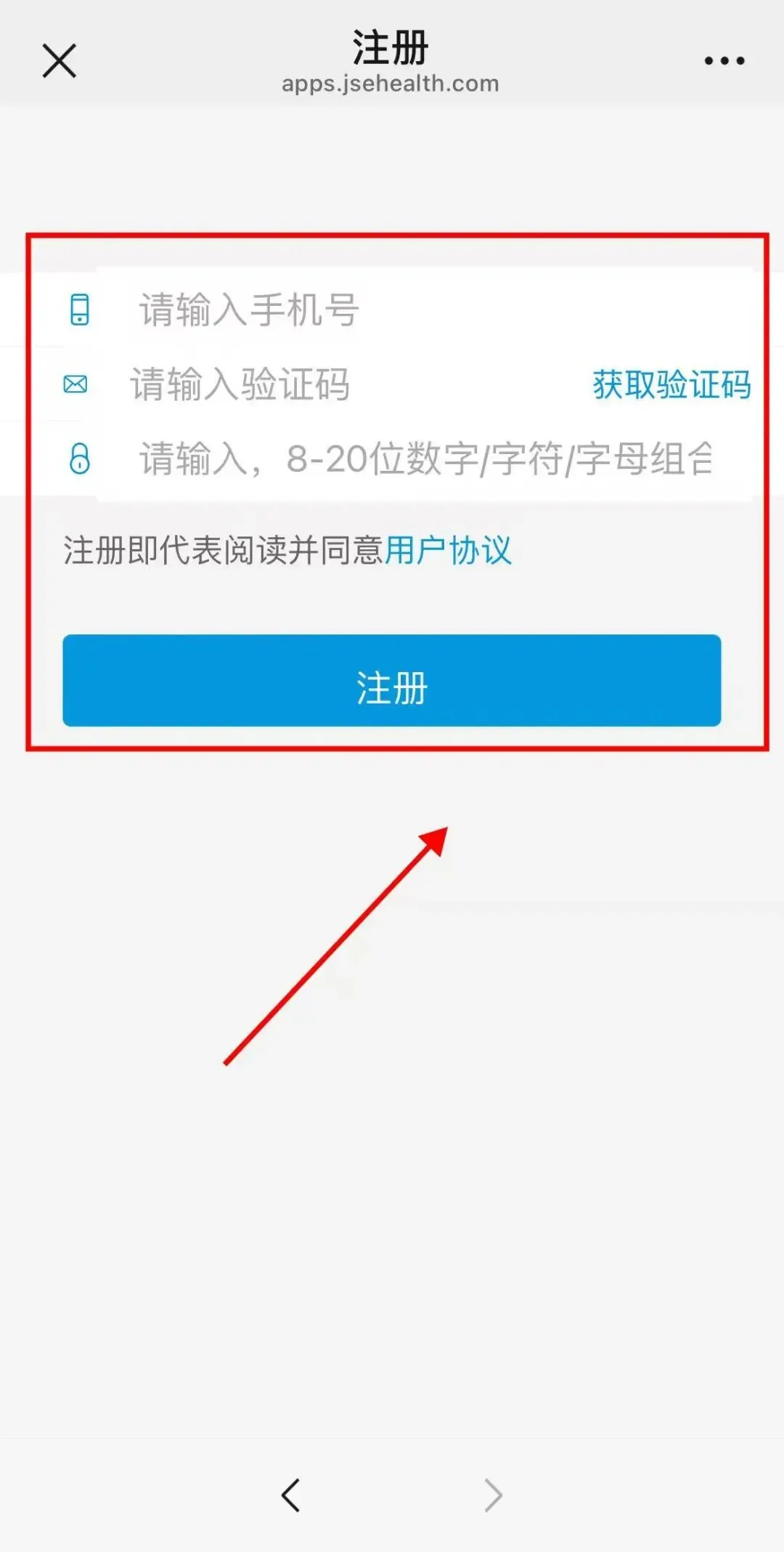 填写个人手机号,设置登陆密码(至少8位长,包含大小写字母数字和特殊字符中的至少三种!),点击“获取验证码”,手机会收到一个4位验证码,输入页面后点击“注册”;在基本信息页面填写准确的姓名、身份证号,选择所在地,点击“提交”,注册成功;