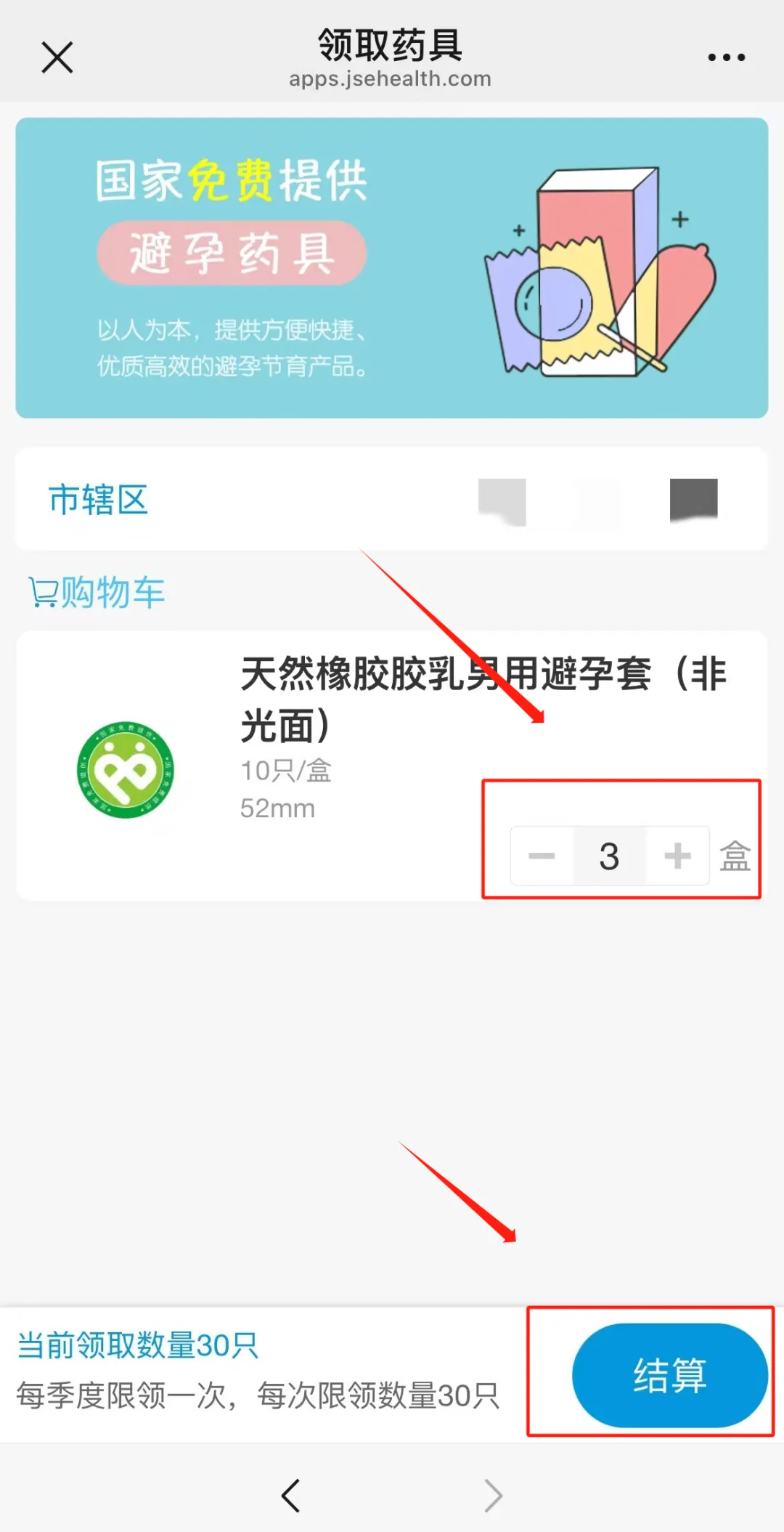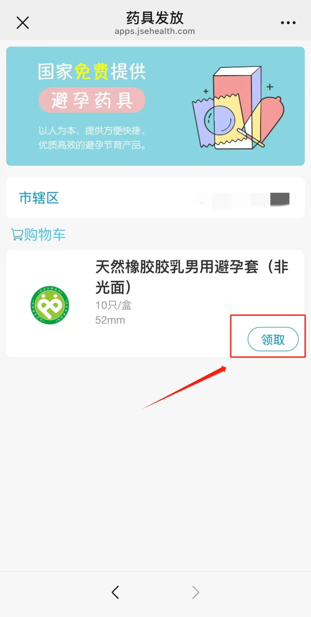 4、页面自动跳转至微信领取首页,此时能看到可以领取的免费避孕药具品种。点击领取,数字后的+号可以增加数量(单位为盒),领取数量有限制,选好后,点击下一步;