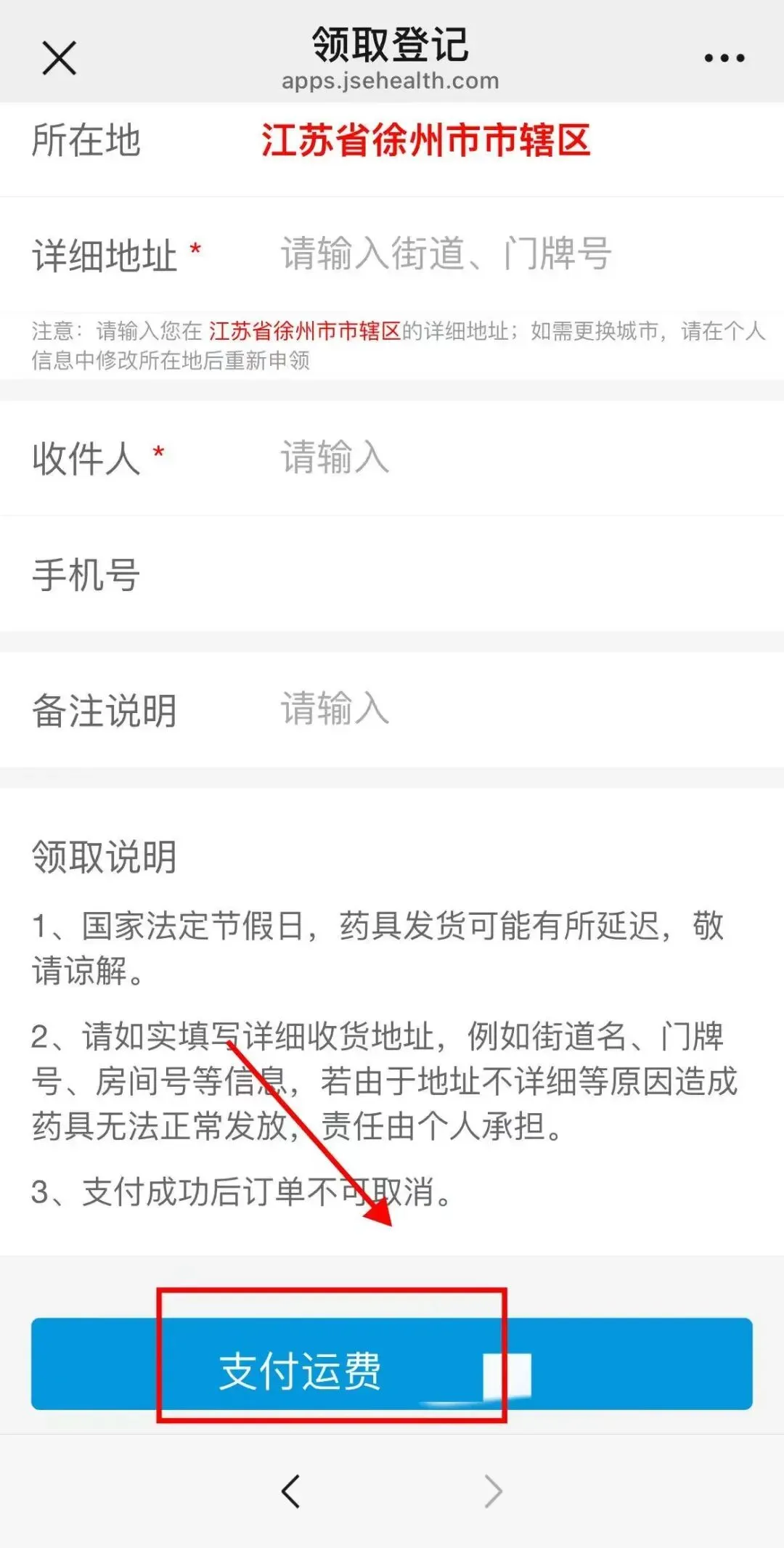 5、进入领取登记页面,填写详细收货地址,收件人,点击“支付运费”(支付成功后订单不可取消),跳转至微信支付页面,付款,完成申领。