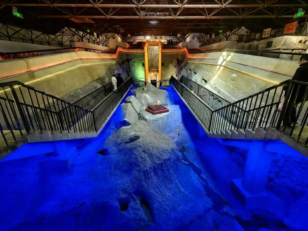 现在我们所在的位置是楚王陵的墓道,从这里向下望过去,特别的壮观!那么,【楚王陵】究竟有多壮观呢?大家请看,整座陵墓呈南北中轴线对称布局,墓道南北总长约117米,东西最宽处13.2米,深入山下20多米,几乎掏空了整座山体,而且掏空面积是龟山汉墓的2倍,这样的规模在汉代诸侯王陵中堪称罕见!