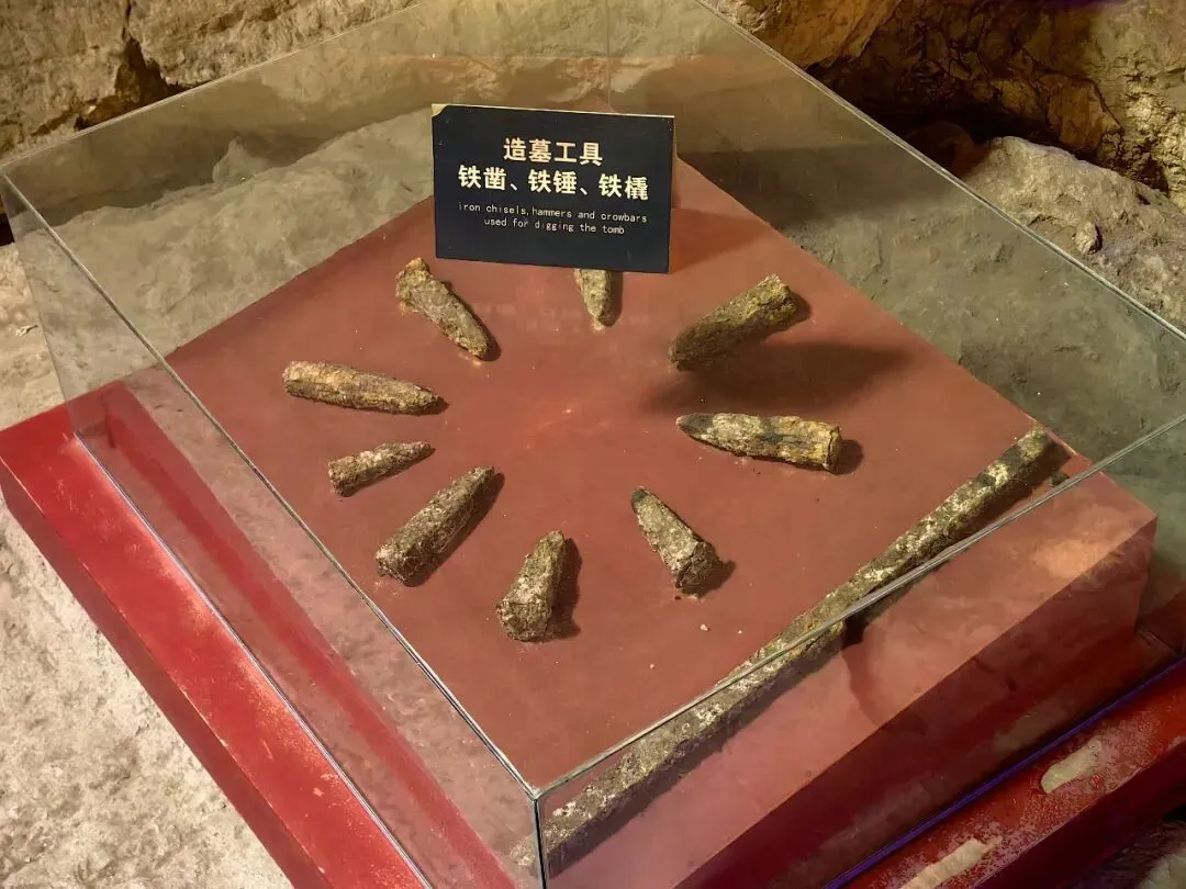 根据考古研究发现,这样壮观的墓室全部是工匠们,用旁边的这些铁锤、铁凿等简陋器具,一点一点纯手工打造出来的,仅开凿墓道就需要上千名工匠花费数年时间,如今两侧墙壁上依然保留着两千多年前的原始凿刻痕迹,也让人不禁惊叹汉代工匠的非凡技艺。