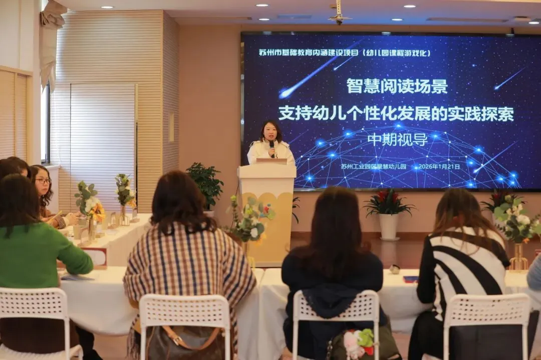 近日,苏州市基础教育内涵建设项目中期视导组莅临星慧幼儿园,对《智慧阅读场景支持幼儿个性化发展的实践探索》项目进行考察。中期视导组由苏州市教科院副院长戈柔、苏州市教育局基础教育处幼教专干杨俐、苏州市实验小学附设幼儿园书记苏蕙三位专家组成,园区教师发展中心副主任胡修喜、李娟园长、幼教中心主任周隽琰、幼教教研员沈娴等,以及来自太仓、昆山的幼教干部、教研员共同莅临本次活动。
