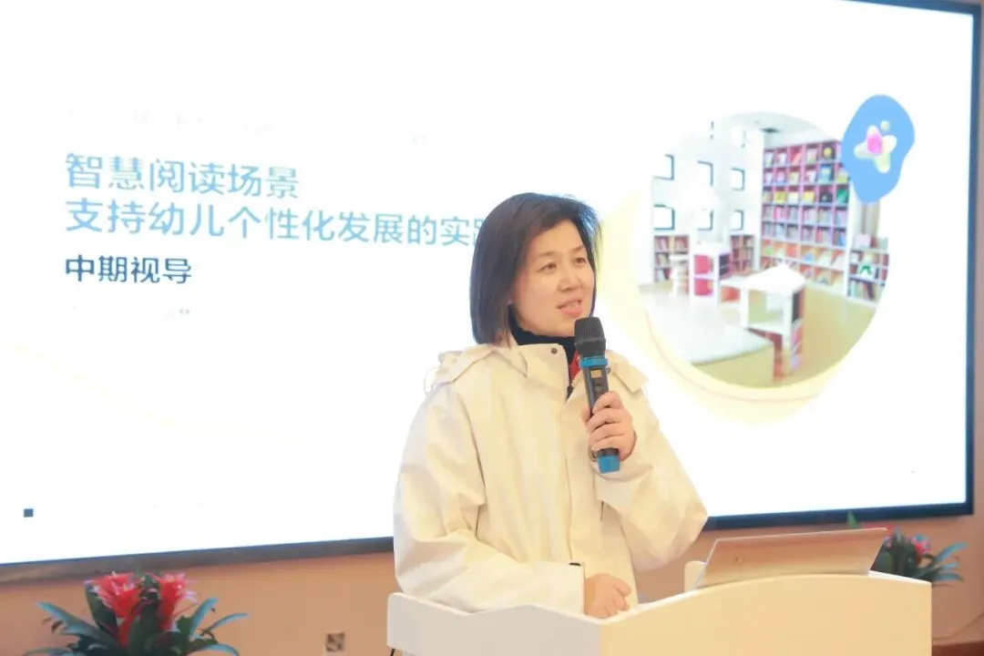 星慧幼儿园园长滕昕围绕项目《智慧阅读场景支持幼儿个性化发展的实践探索》作中期工作汇报,她从项目建设目标、核心内容、推进思路、当前实施进展、阶段性成效及下阶段优化方向等方面展开,清晰呈现了园所依托智慧场景在幼儿个性化支持方面的阶段性实践。