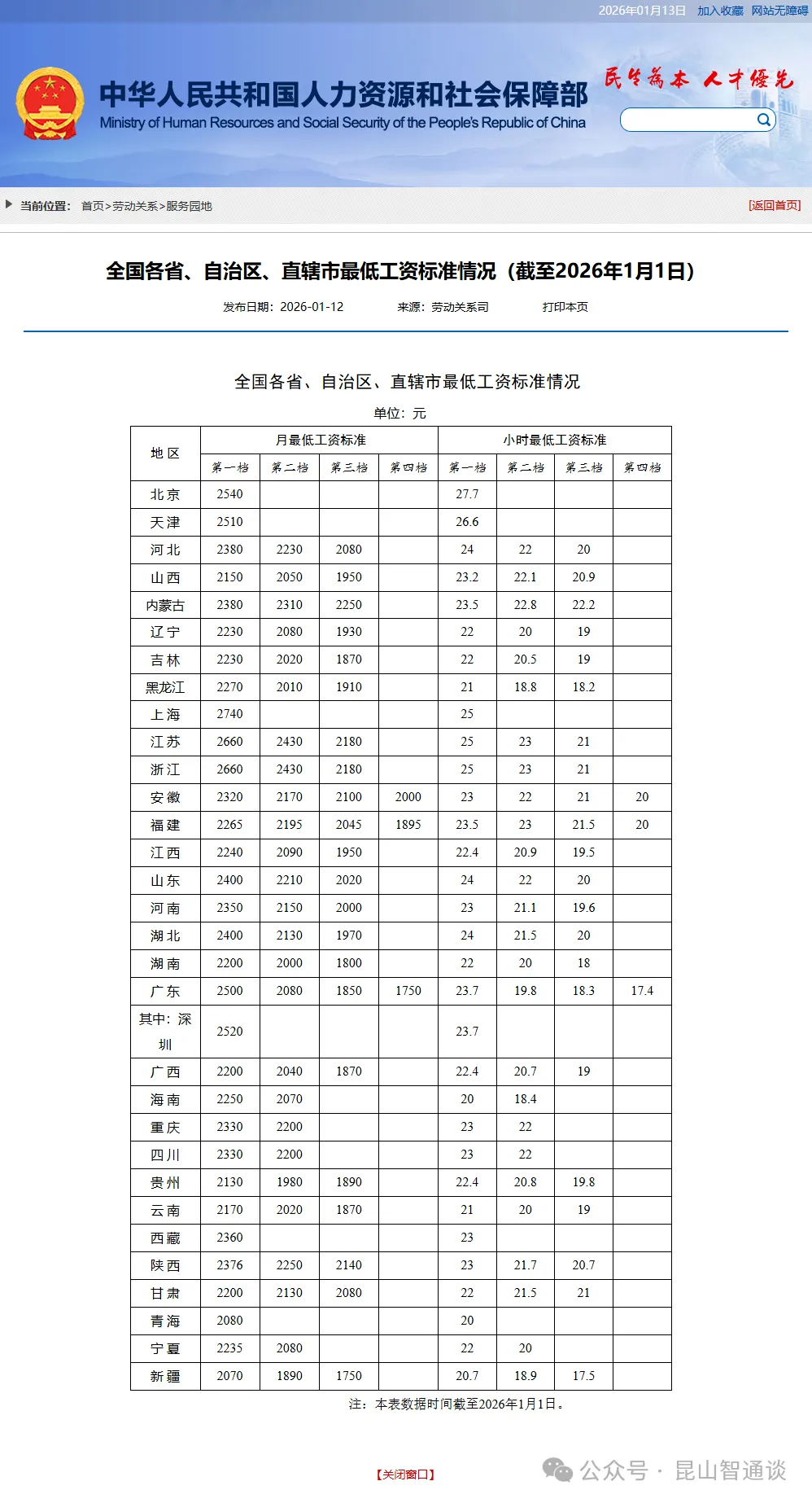 #点击图片放大查看打工人注意啦!2026年1月12日,人社部官网发布截至1月1日的全国最低工资标准,数据每季度首月更新,目前最多分四档执行。数据显示,江苏第一档月最低工资2660元,第二档2430元,第三档2180元,江苏小时最低工资第一档25元,第二档23元,第三档21元。依据《最低工资规定》,最低工资分月、小时两类,适配不同就业形式。值得一提的是,多数地区最低工资含个人 “五险一金”,而京沪不含,“含金量” 更高。此外,最低工资上调还会带动失业保险金、病假工资等同步提高,切实惠及劳动者!来源:人社部网站